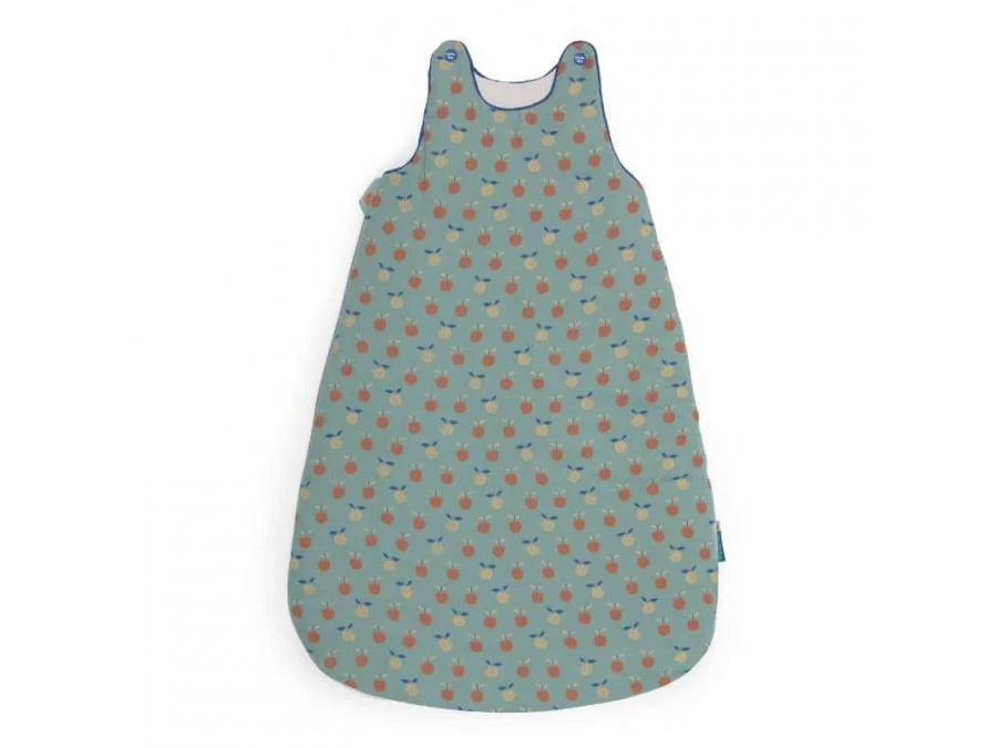 Gigoteuse 0-6 mois (TOG 3,8) en coton certifié OEKO-TEX®, avec imprimé petites pommes à l’extérieur et doublure couleur crème. Fermeture à glissière et boutons-pression pour un habillage facile.