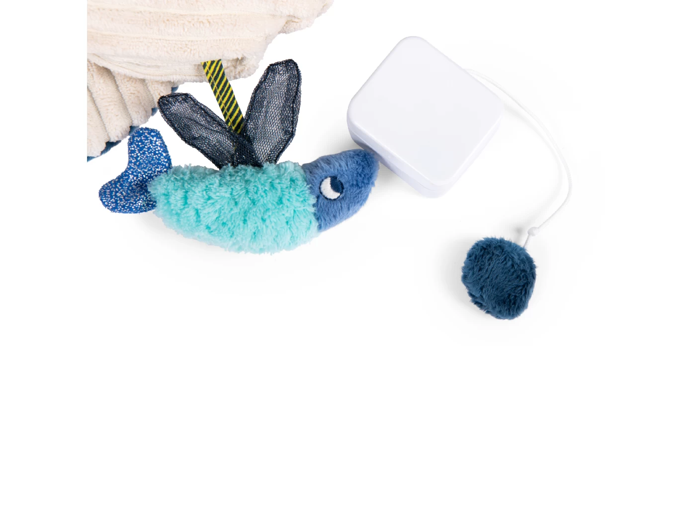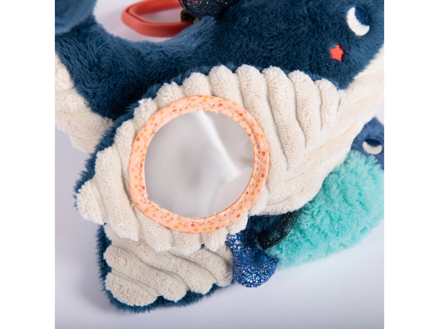 Cette baleine musicale est dotée d’une accroche universelle. Au son de sa douce mélodie, bébé s’endormira paisiblement et à son réveil il pourra jouer avecle miroir sous la nageoire et redécouvrir les diverses textures de ce tendre cétacé.