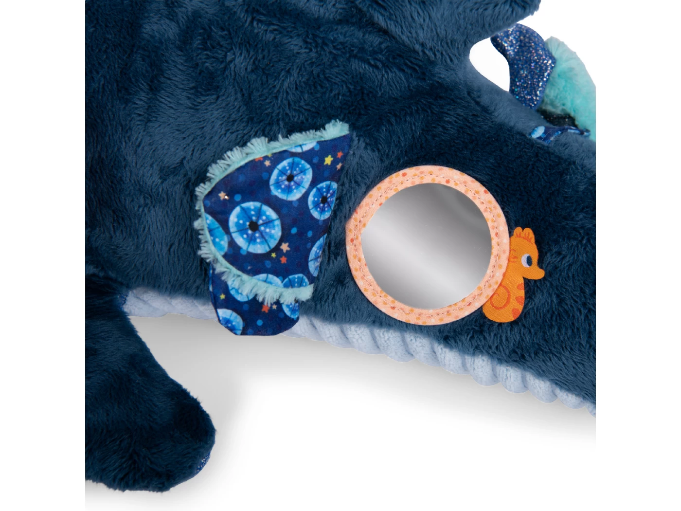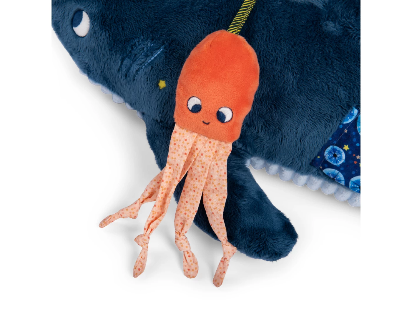 Ce gentil requin bi-matières cherche un ami pour jouer ! Sur son dos tout doux sont cachées de petites créatures marines comme autant d’activités sensorielles à découvrir : miroir, grelot, papier crissant, étiquettes à attraper…