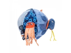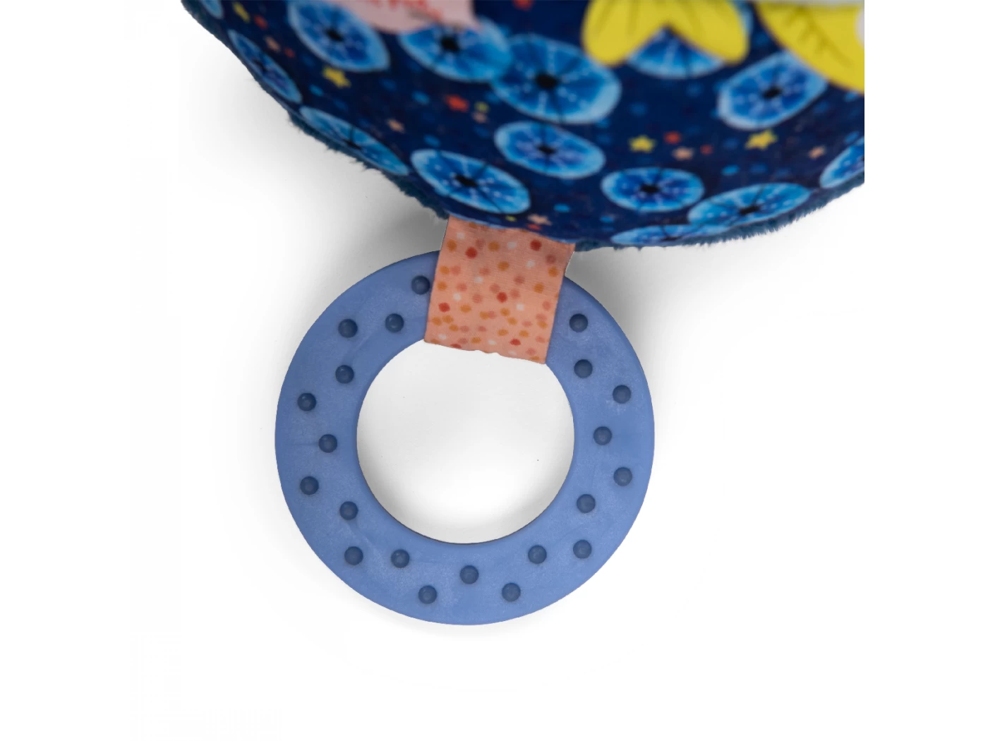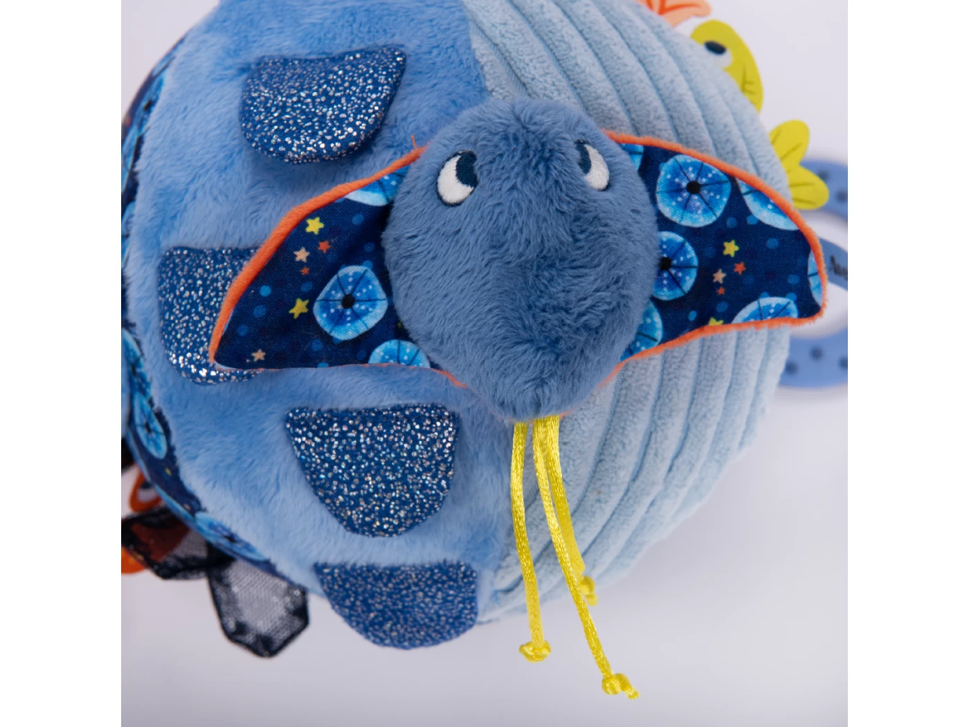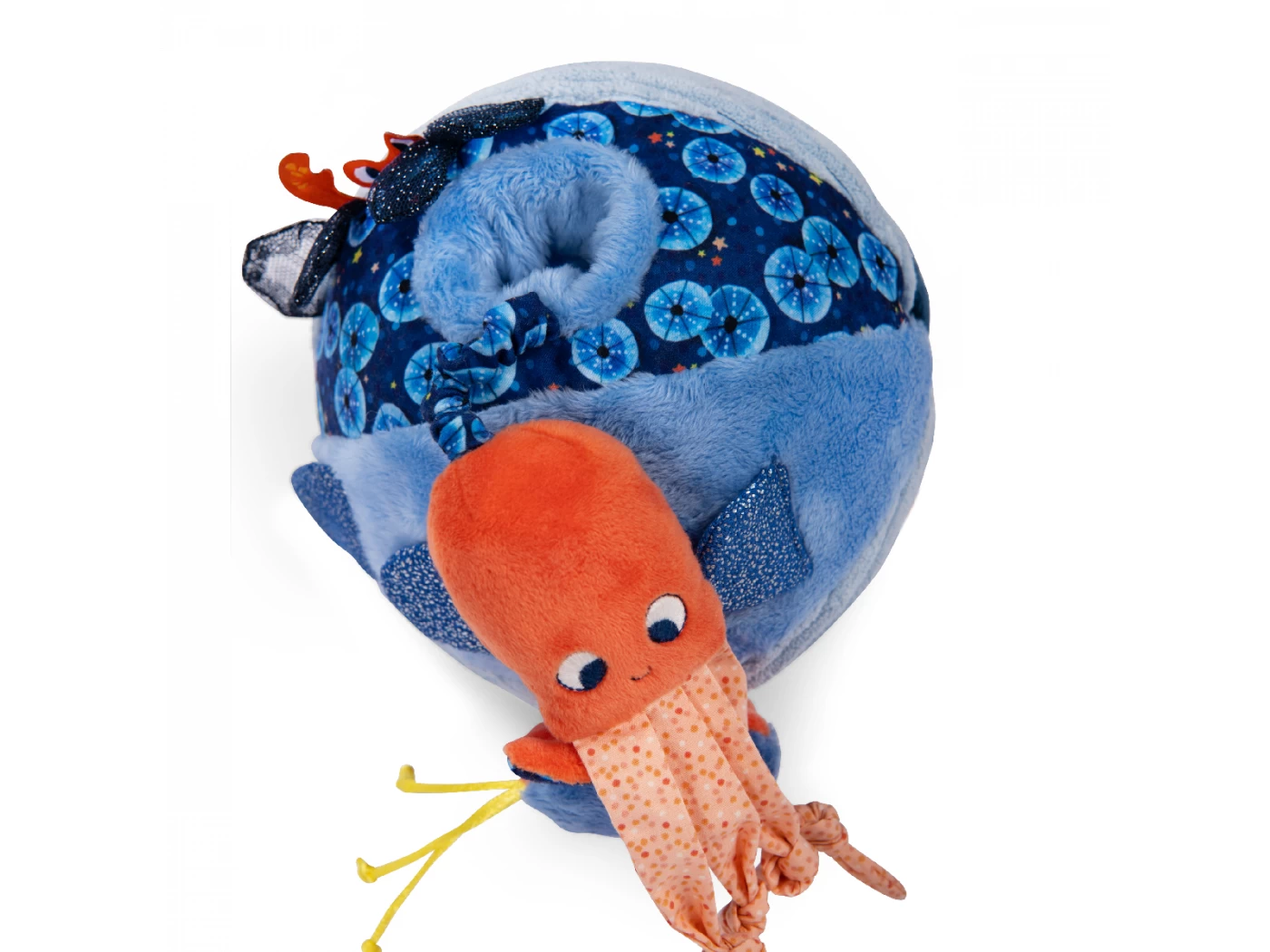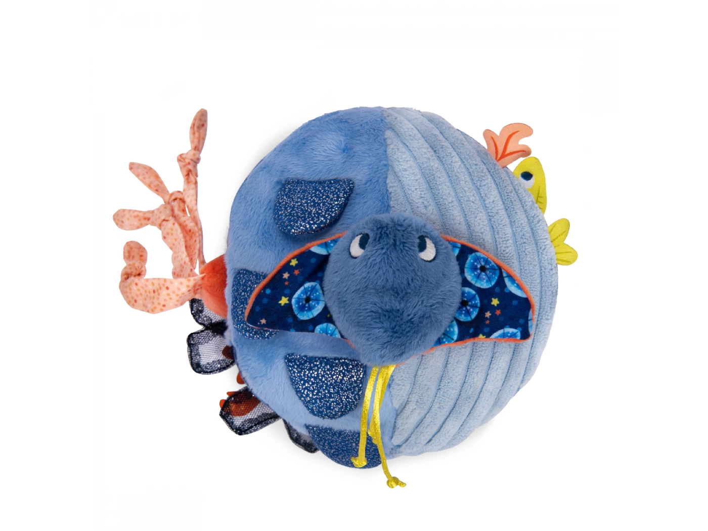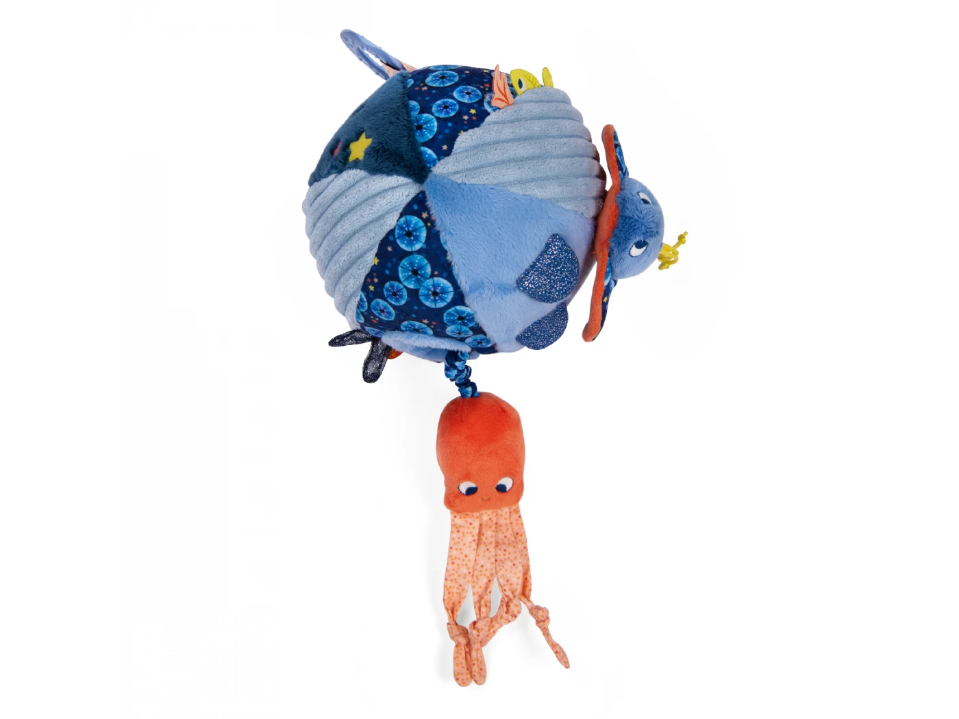 La balle d’activités regorge de gris-gris colorés sur ses 6 faces. On y trouve algues et écailles pailletées, un poulpe caché, une raie délicatement posée… Mais aussi de quoi se soulager la poussée dentaire avec un anneau à mâchouiller !