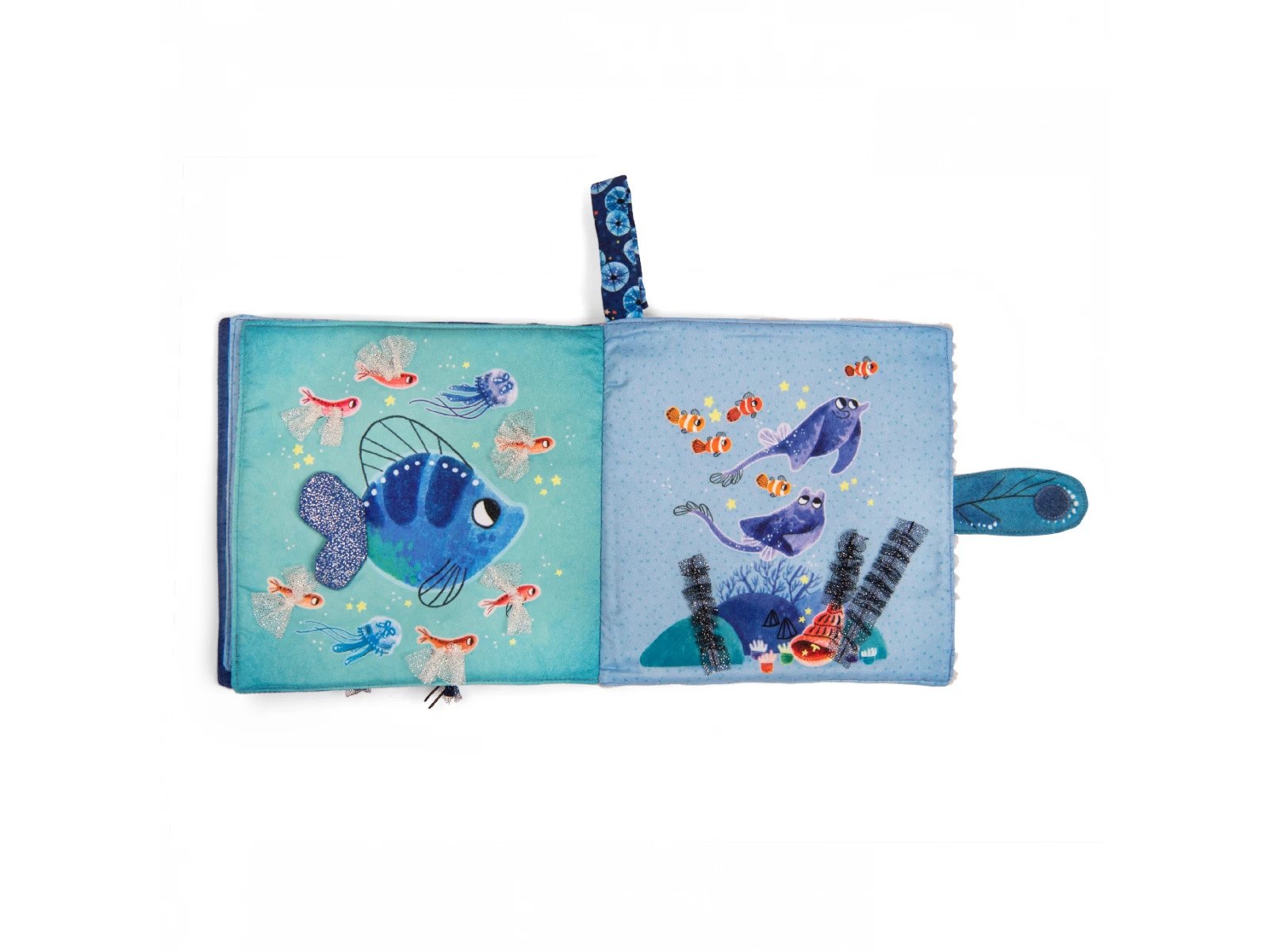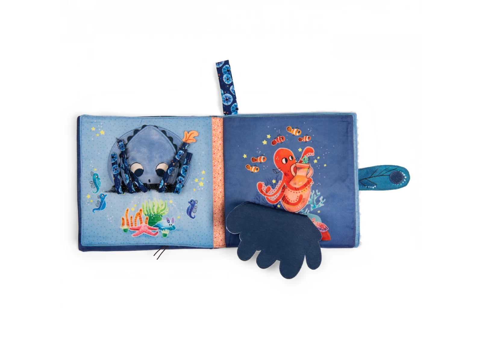 Livre tissu jouant sur les contrastes de matières et activités cache-cache intitulé Possède un système d’accroche