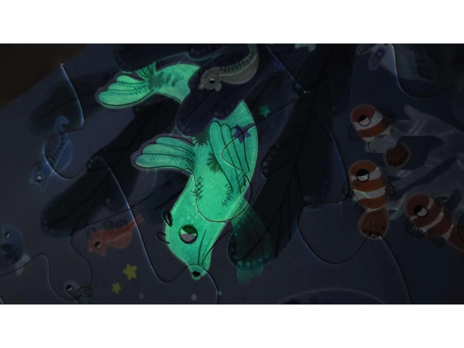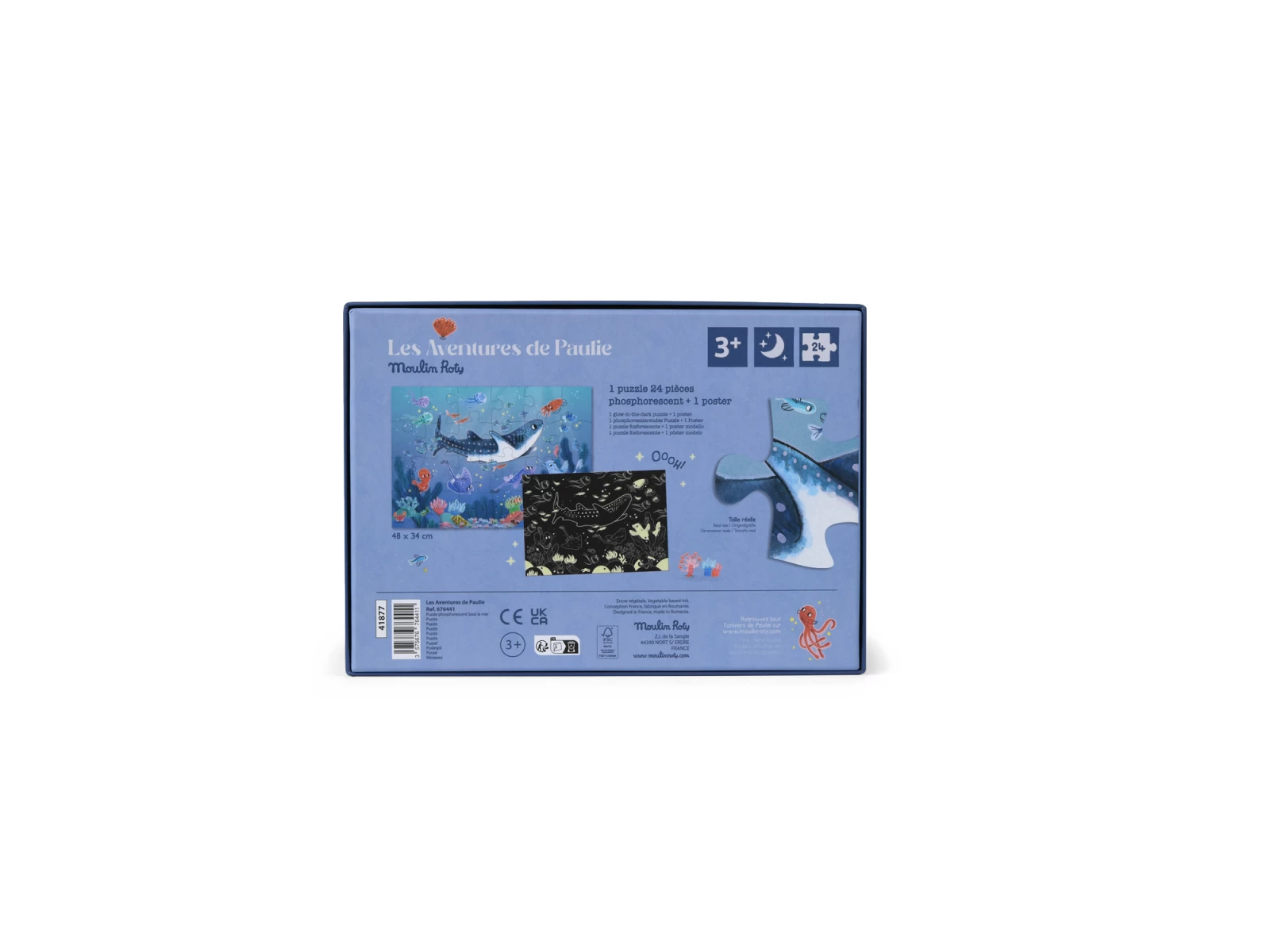 Rendez-vous sous la mer avec ce puzzle phosphorescent de 24 pièces issu de la collection Les aventures de Paulie ! Après l’avoir reconstitué, éteins la lumière afin que la magie opère.Contient 1 poster modèle pour aider l’enfant à le recomposer facilement