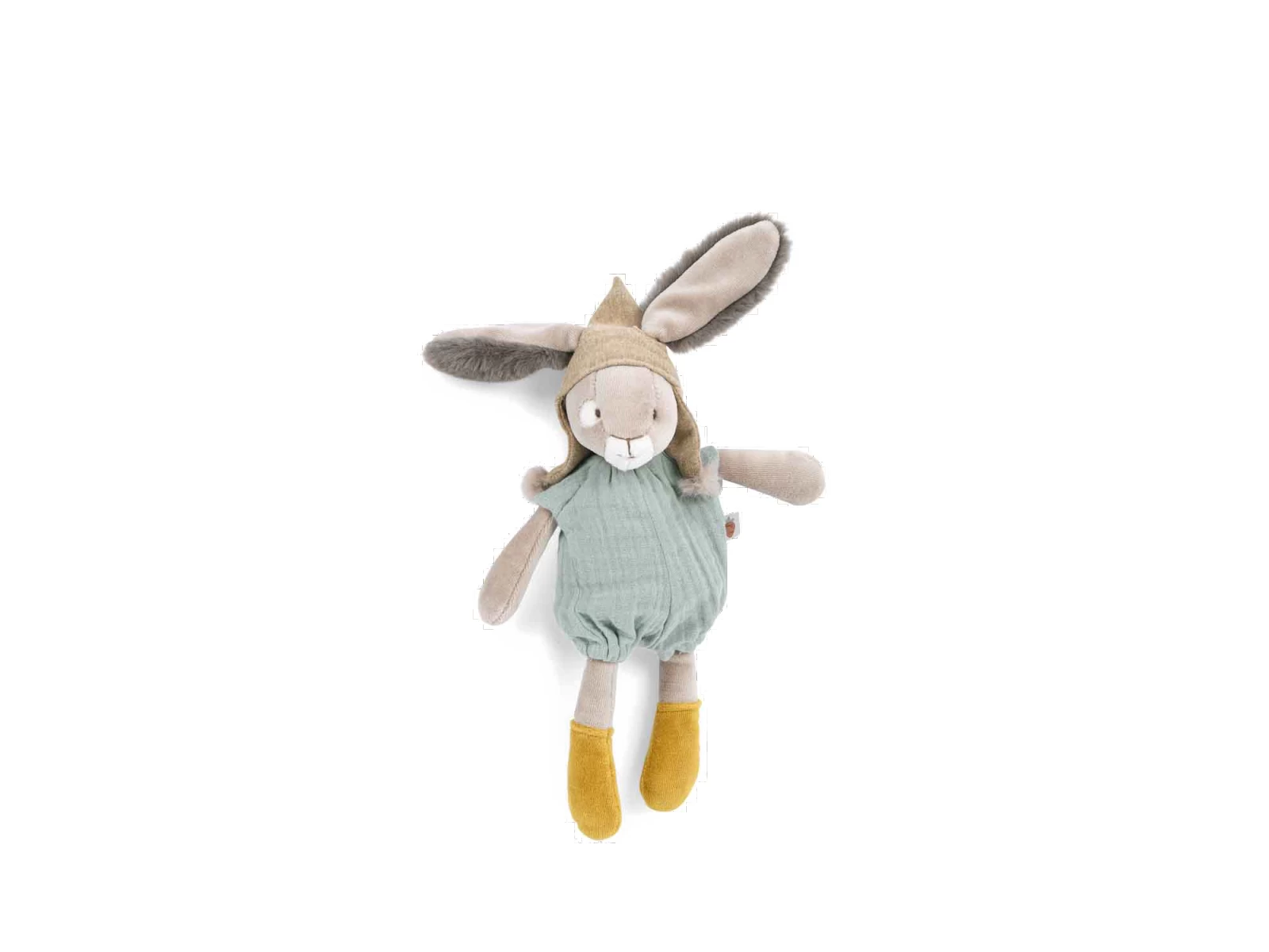 Petit lapin en velours éponge, vêtu de sa barboteuse sauge en lange. Coiffé d’un bonnet à pompons qui laisse passer ses grandes oreilles en fourrure toute douce, ce compagnon apaisant et rassurant est facile attraper par les petites mains.