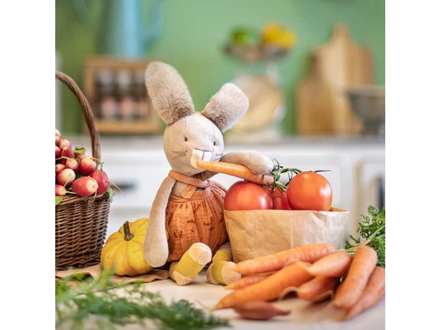 Avec sa frimousse à moustaches et ses grandes oreilles toutes douces, cet adorable lapin à la salopette argile ne demande qu’à faire des câlins ! Compagnon de jeu la journée et doudou protecteur la nuit, il accompagnera bébé dans toutes ses aventures.