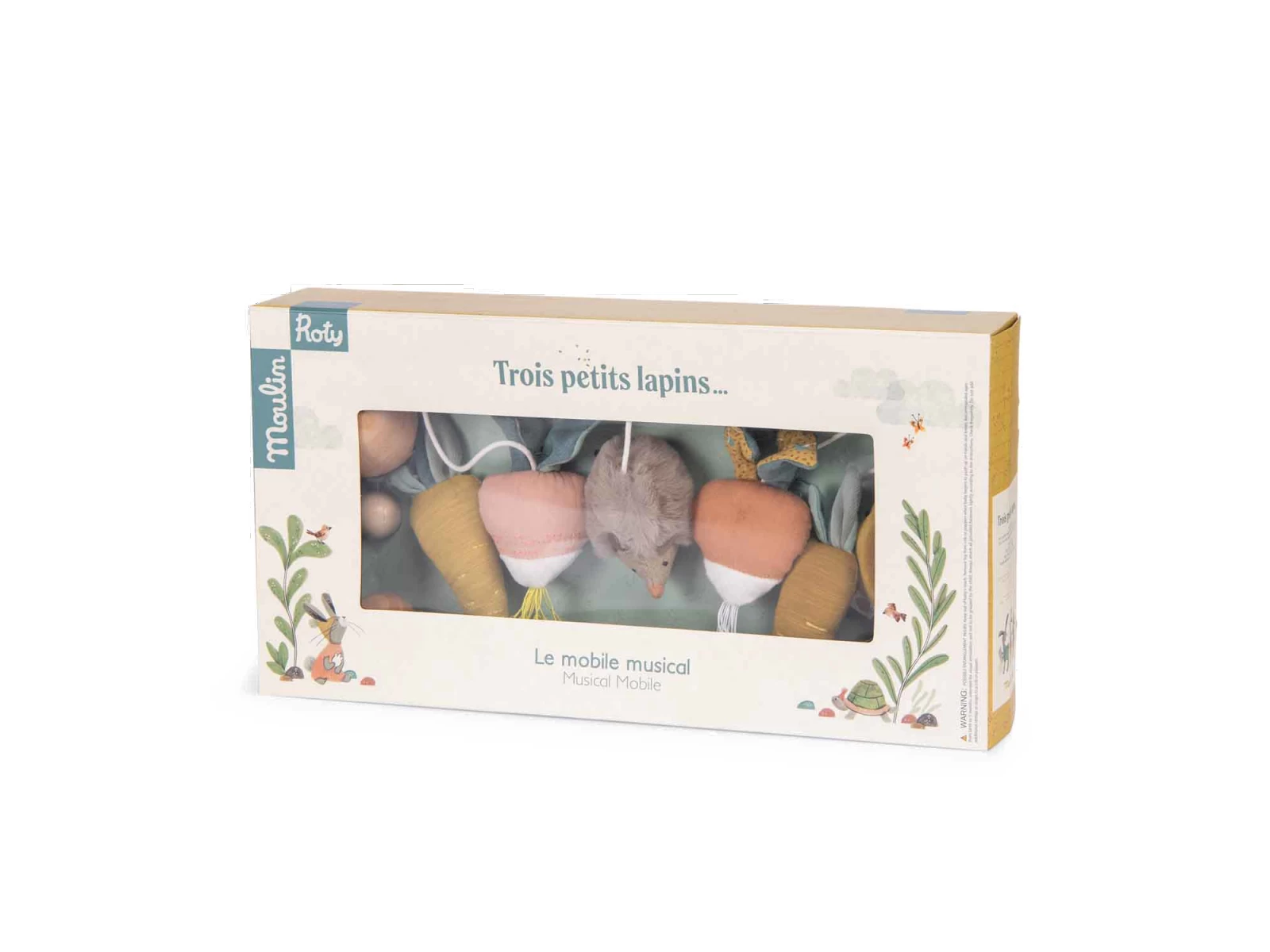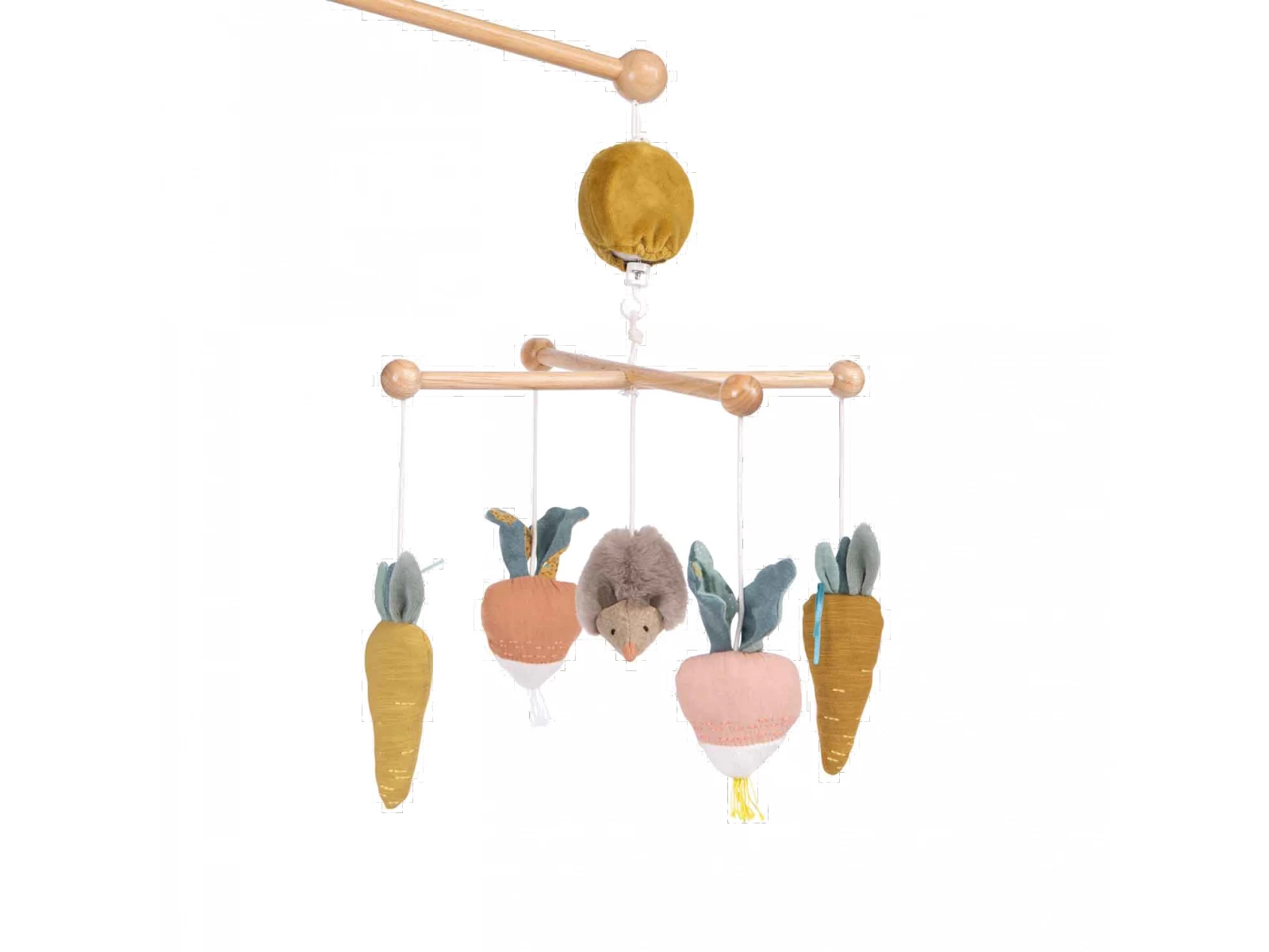 Mobile musical aux couleurs tendres pour éveiller la vue et l’ouïe de bébé, puis l’endormir tout en douceur. Sur une structure en bois, un petit hérisson danse au milieu des légumes du jardin : carottes et radis… avant de rejoindre le pays des rêves.