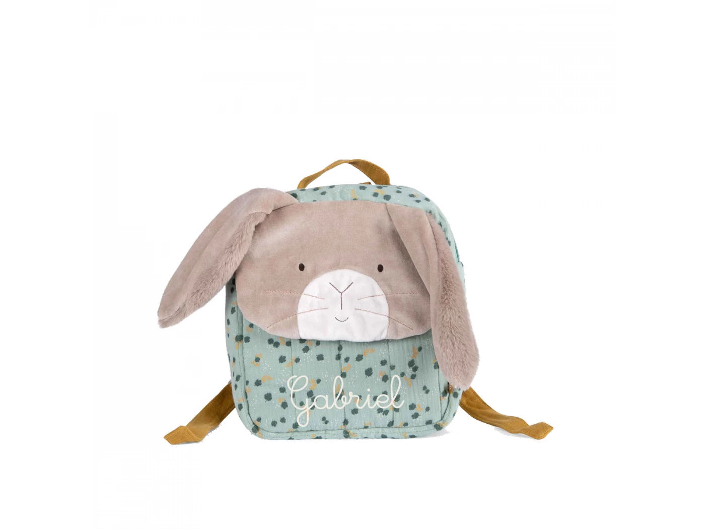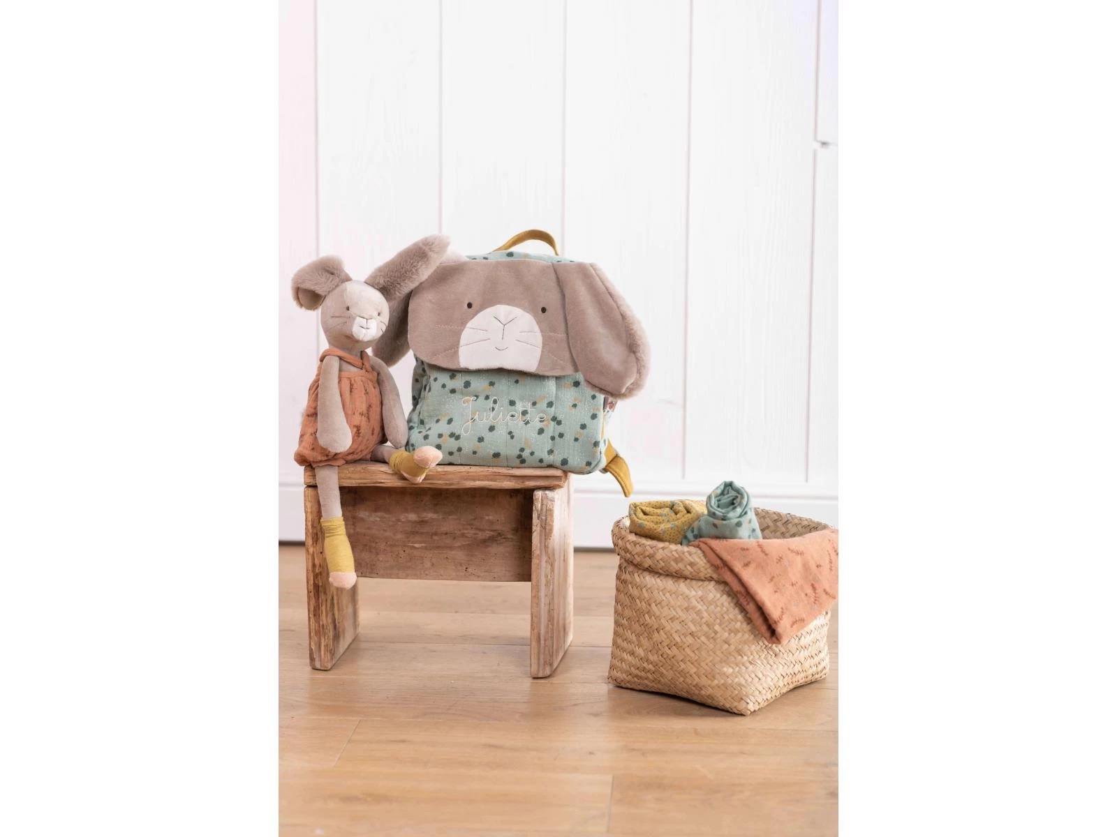 Sac à dos lapin ocre aux oreilles tombantes toutes douces, en lange et velours éponge. Pratique, il dispose d’une poche avant plaquée, d’une fermeture à zip, de bretelles réglables et d’un crochet porte-manteau ! Il peut être brodé au prénom de l’enfant !