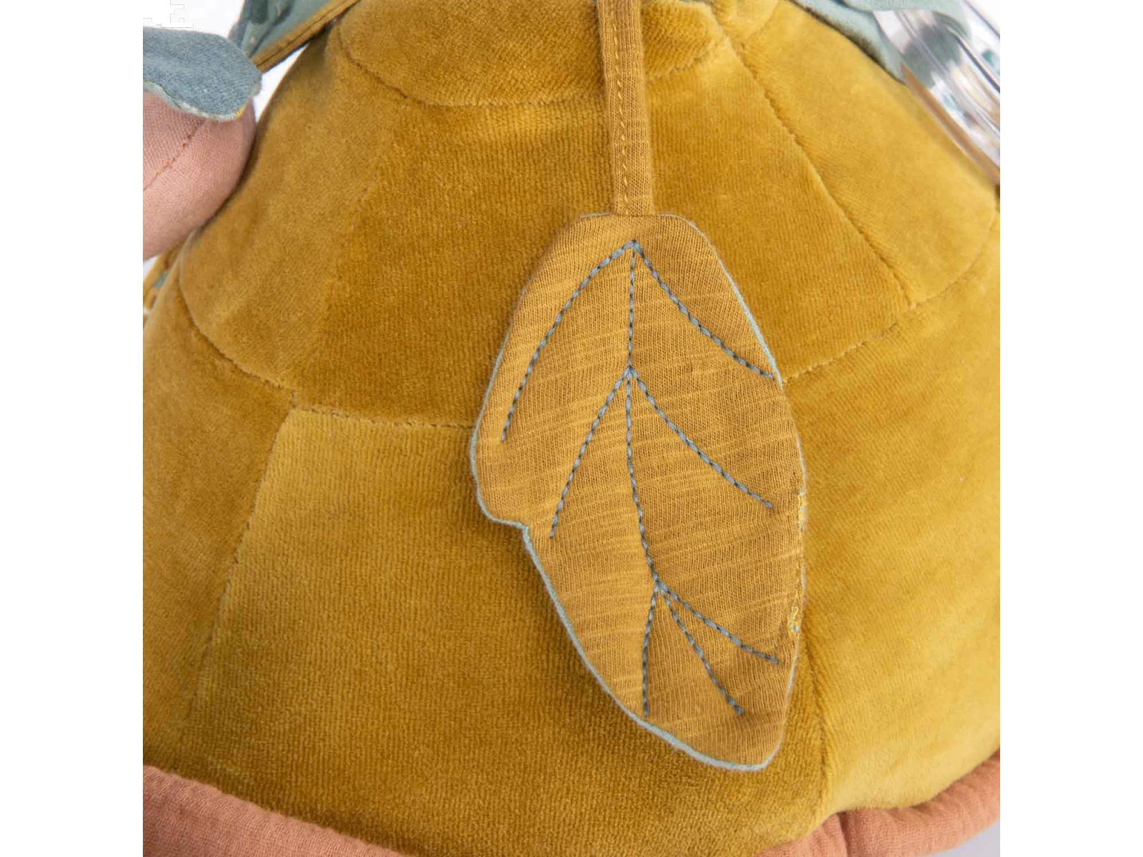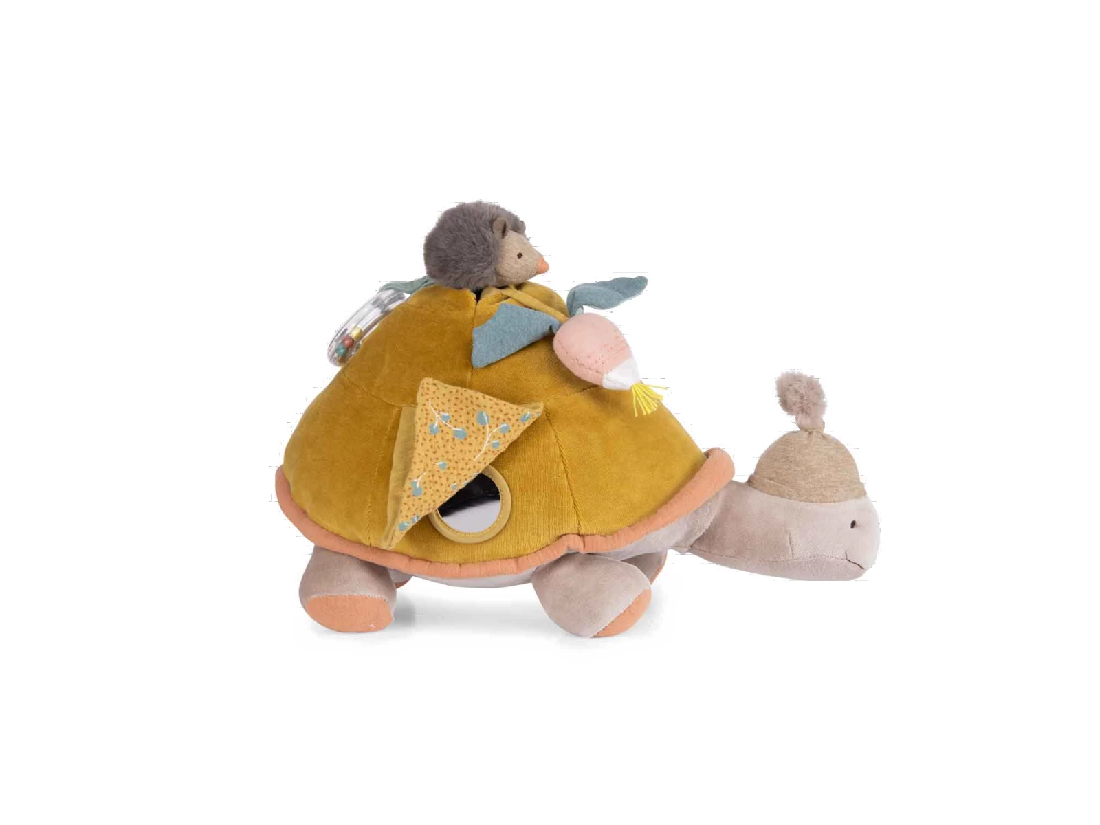 La tortue d’activités en lange et velours accompagnera les petits dans l’exploration, avec grelots, anneau à billes colorées, papier crissant, miroir… qu’elle cache dans sa carapace tout douce. Surprise, elle transporte avec elle, un petit hérisson hochet