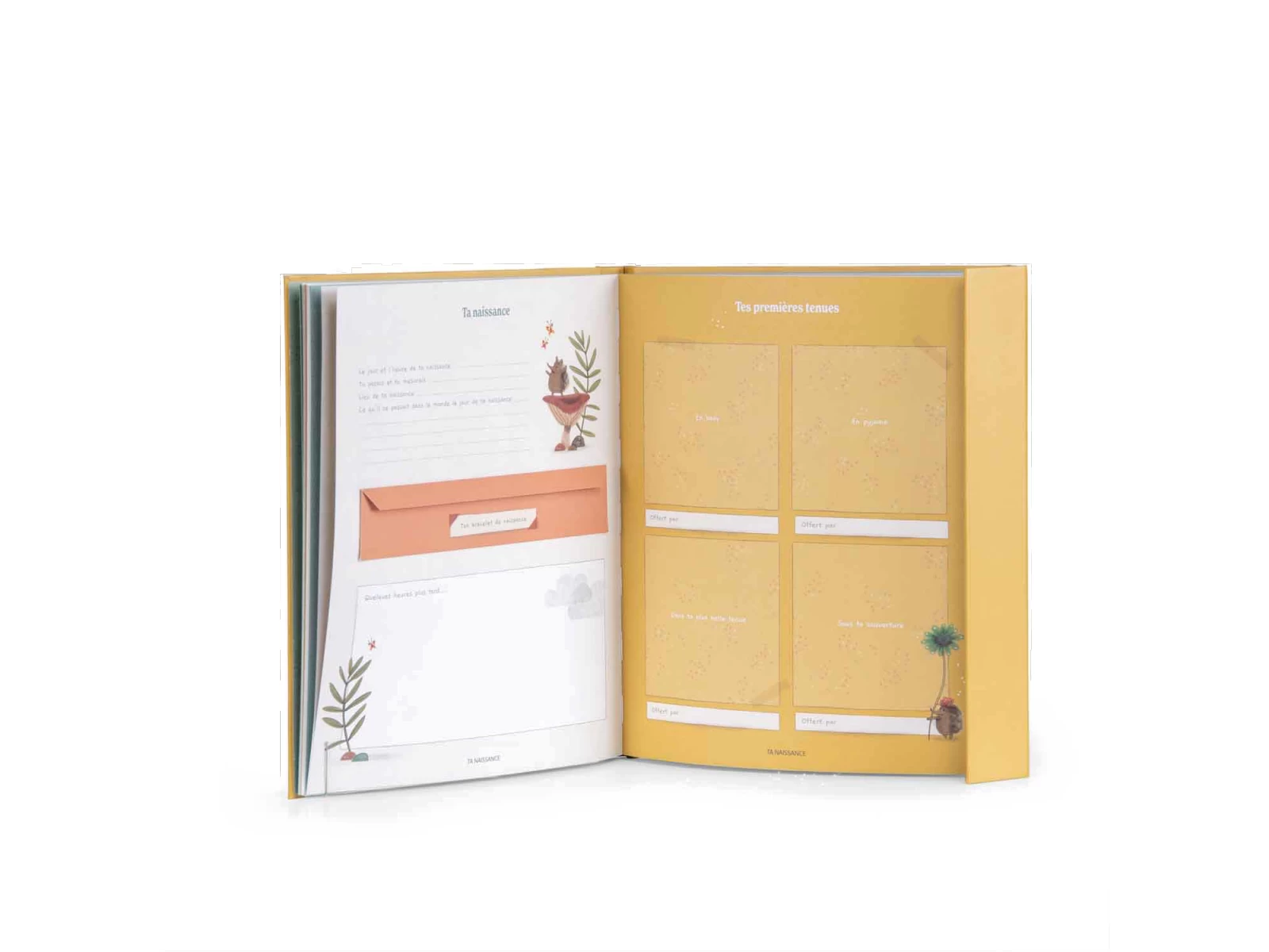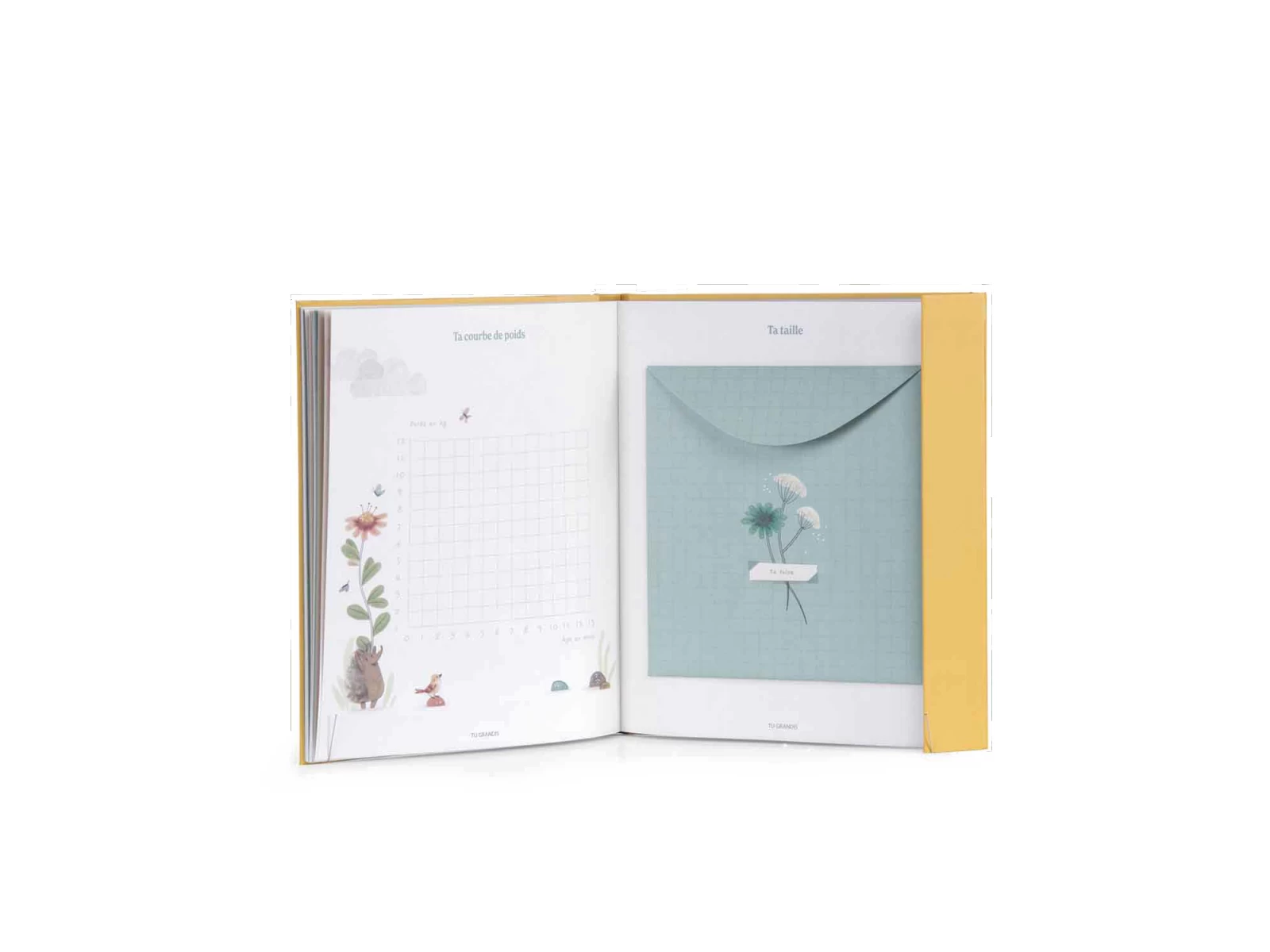 Ce livre à trésors de 80 pages illustrées, accompagne les enfants de ses premiers jours à ses 6 ans. Un recueil de mots et d’images, avec 6 enveloppes à souvenirs et 1 toise en cadeau. Fermeture aimantée, et textes non genrés pour l’enfant et les parents.