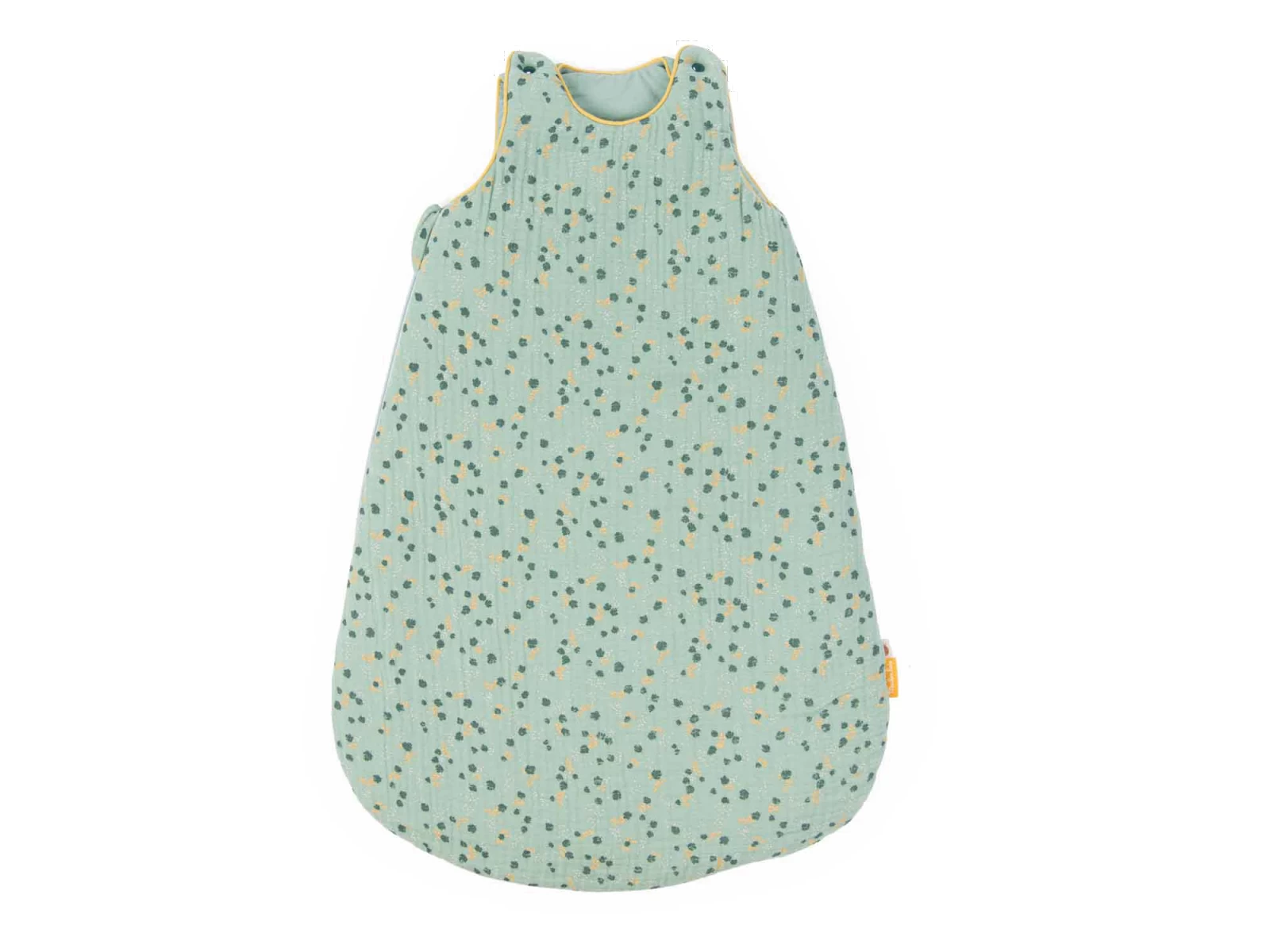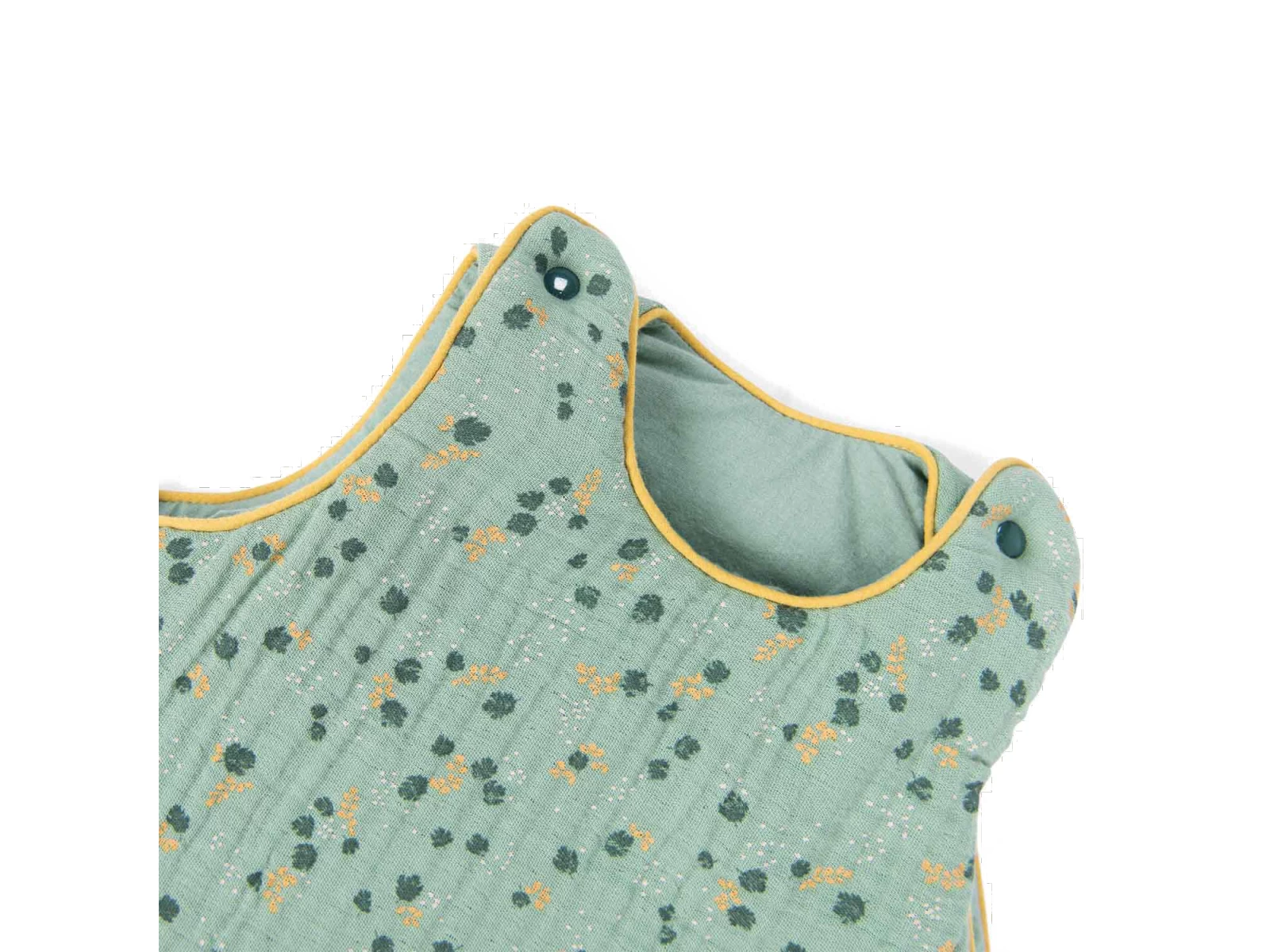 Gigoteuse 6-24 mois (TOG 3,8) en lange imprimé sauge, certifiée OEKO-TEX®et doublure en toile verte, à la fois chaude et respirante. Fermeture à glissière et boutons-pression pour un habillage facile.