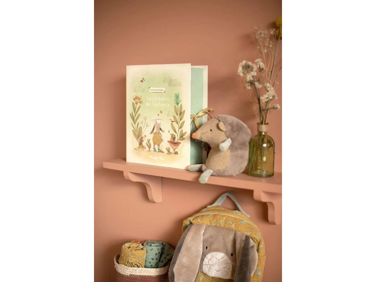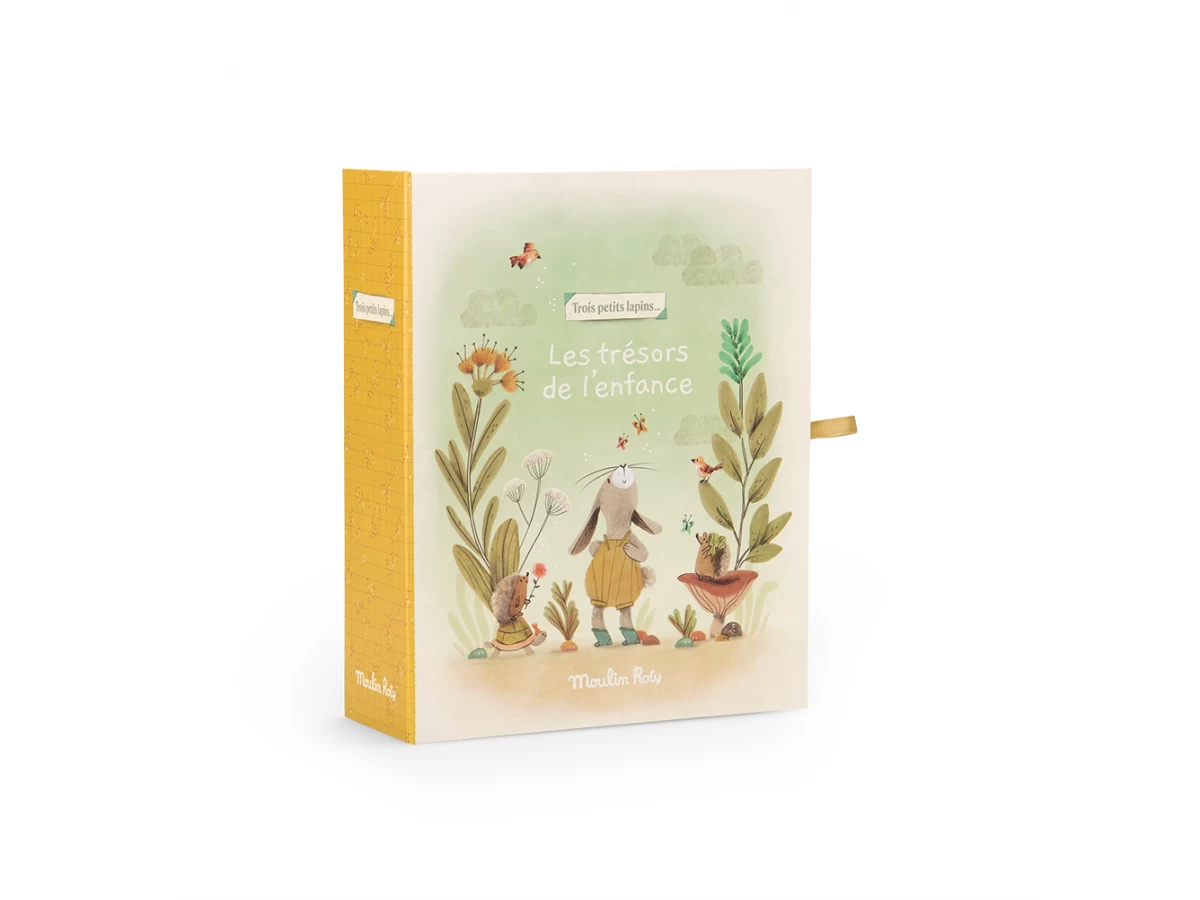 Coffret à trésors pour conserver les souvenirs de bébé dans chacun des tiroirs … Se referme avec de jolis liens et reprend les tendres illustrations des personnages de la collection Trois Petits lapins à l’intérieur comme à l’extérieur.