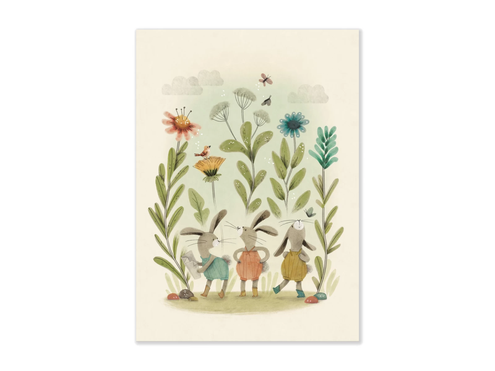 Affiche 50x70cm de la collection Trois Petits Lapins. Les voilà partis tous les trois pour une grande exploration dans le jardin… Imprimé en France à base d’encres végétales sur du papier certifié FSC.