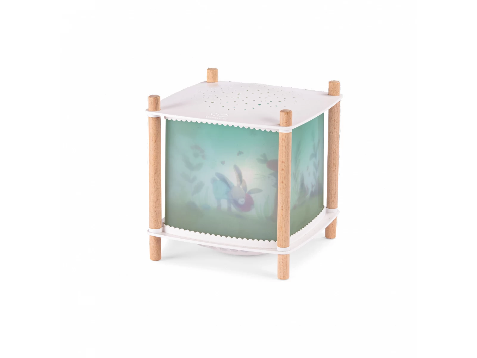 Lanterne magique pour endormir bébé avec les lapins au jardin, comme décor dans la chambre. Multifonction, elle projette des étoiles, joue 4 berceuses, se connecte à distance et détecte même les pleurs ! Câble USB inclus. En partenariat avec Trousselier.