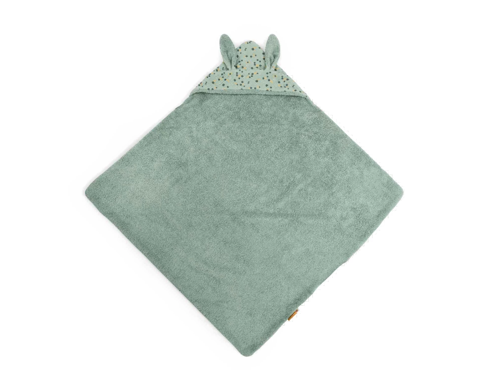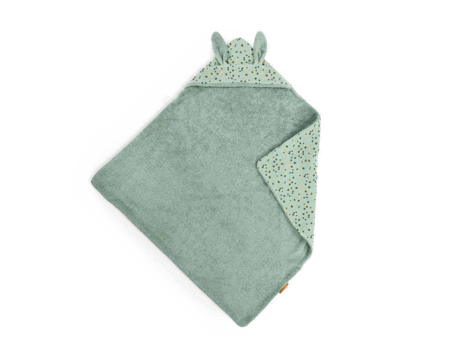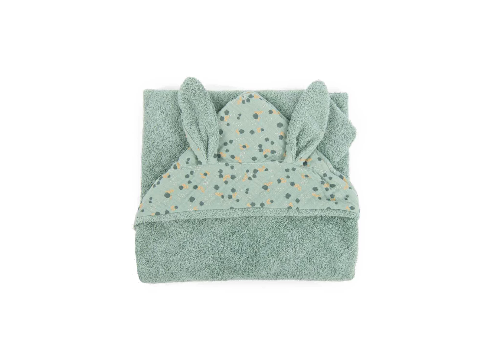 Cape de sortie de bain sauge 100% coton en lange et éponge bouclette, certifiée OEKO-TEX®, avec une capuche en tête de lapin pour accueillir chaudement bébé à la sortie du bain. Peut être brodé au prénom de l’enfant. Idéal pour un cadeau naissance.