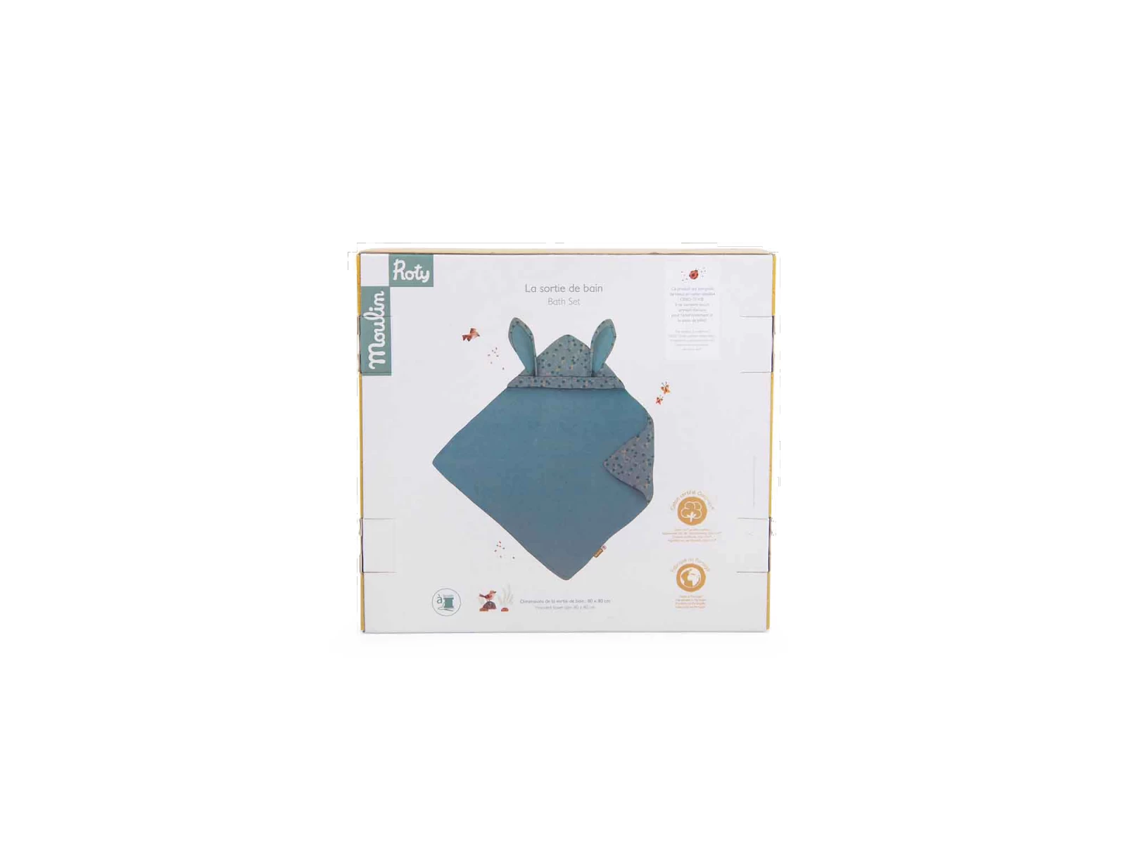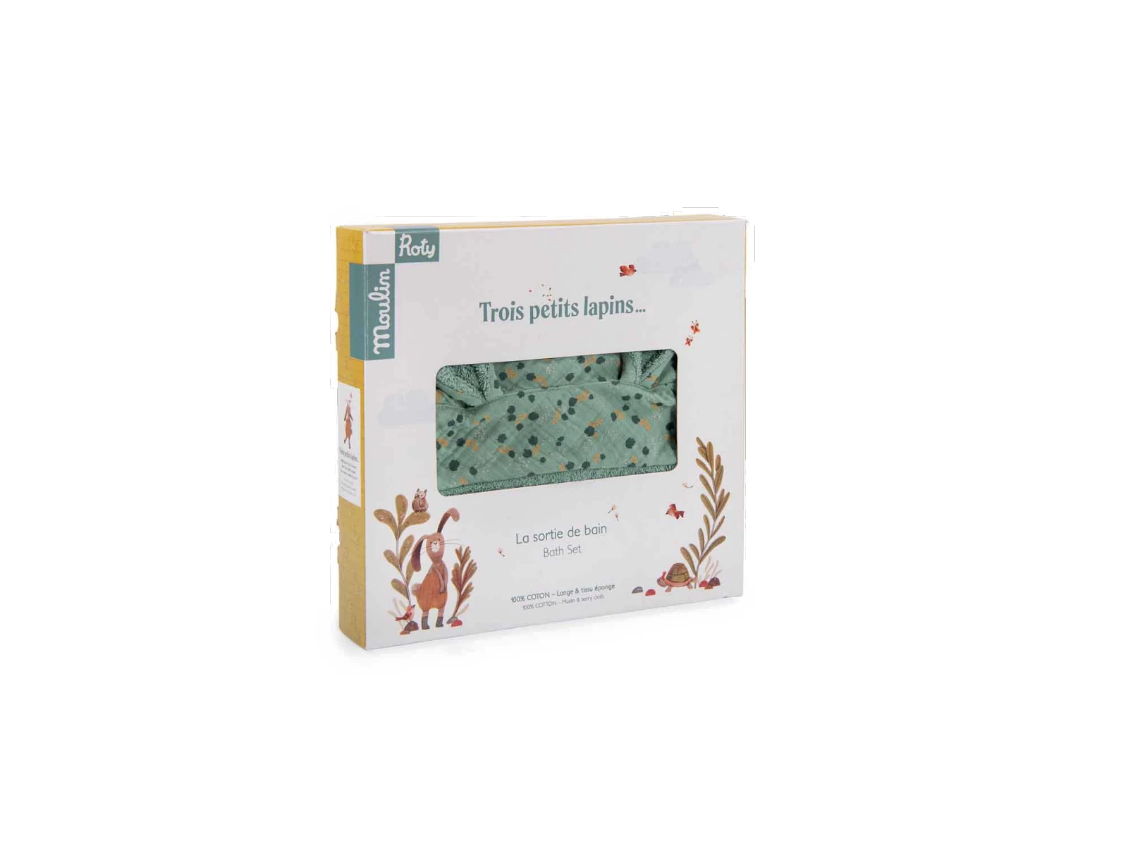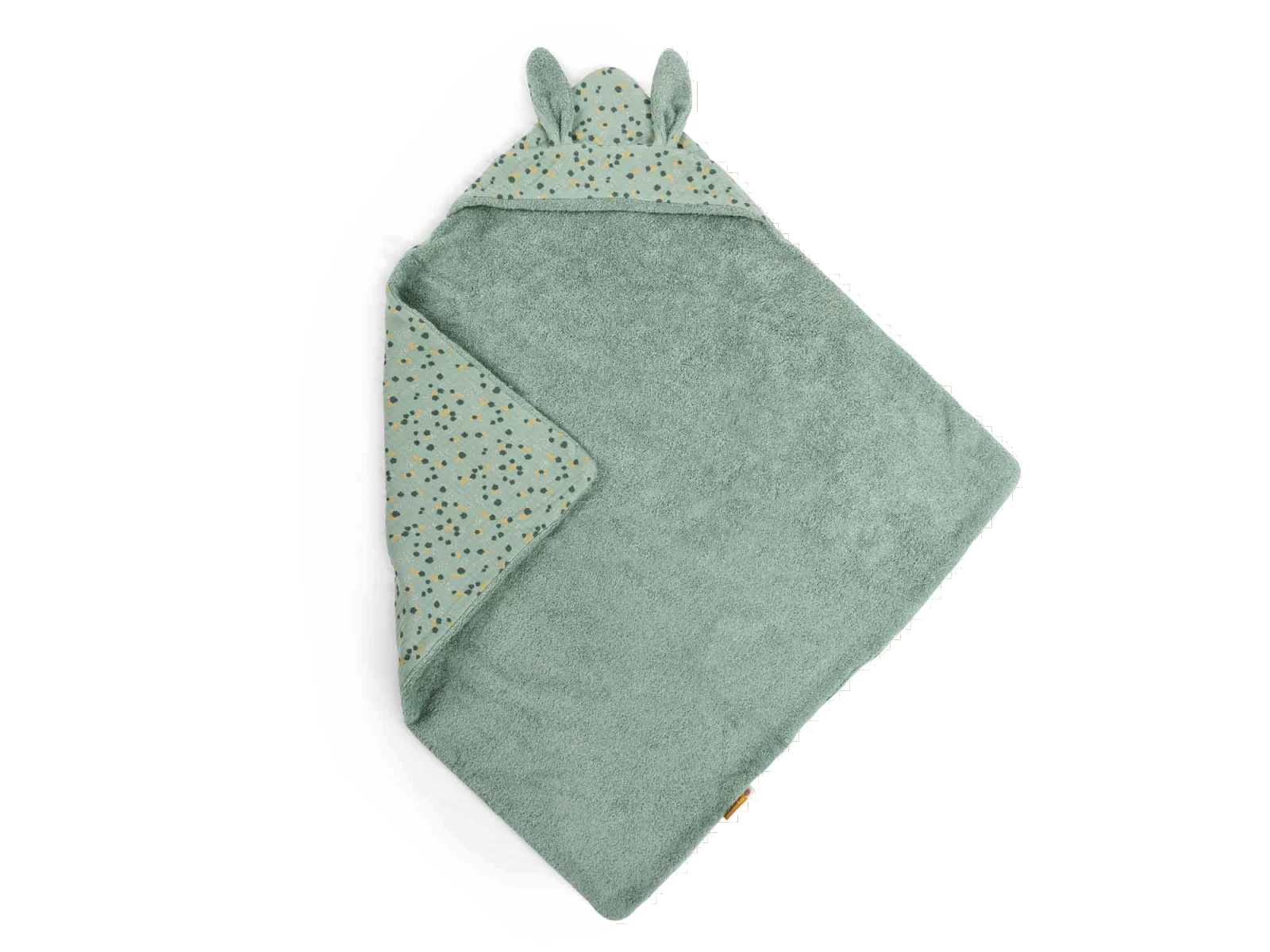 Cape de sortie de bain sauge 100% coton en lange et éponge bouclette, certifiée OEKO-TEX®, avec une capuche en tête de lapin pour accueillir chaudement bébé à la sortie du bain. Peut être brodé au prénom de l’enfant. Idéal pour un cadeau naissance.