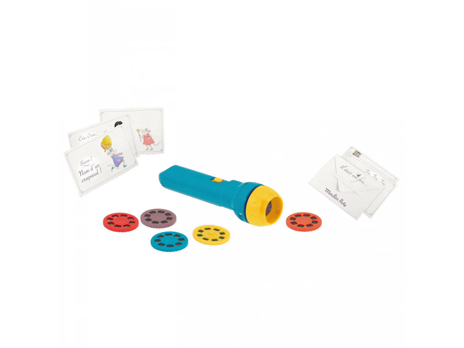 Ravissant coffret aimanté, joliment illustré, conçu comme un livre et contenant : une lampe à projeter avec 5 histoires de contes et de précieux cartons d’invitation aux spectacles, en forme de mini enveloppes avec des messages secrets.