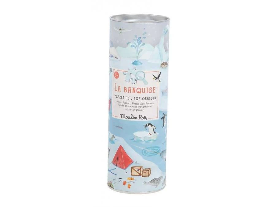 Un puzzle de 96 pièces illustrant à l’aquarelle les fabuleux animaux de la banquise… Le puzzle est rangé dans un joli tube illustré où l’on retrouve un poster avec un imagier au dos, et une loupe pour observer la scène de plus près !