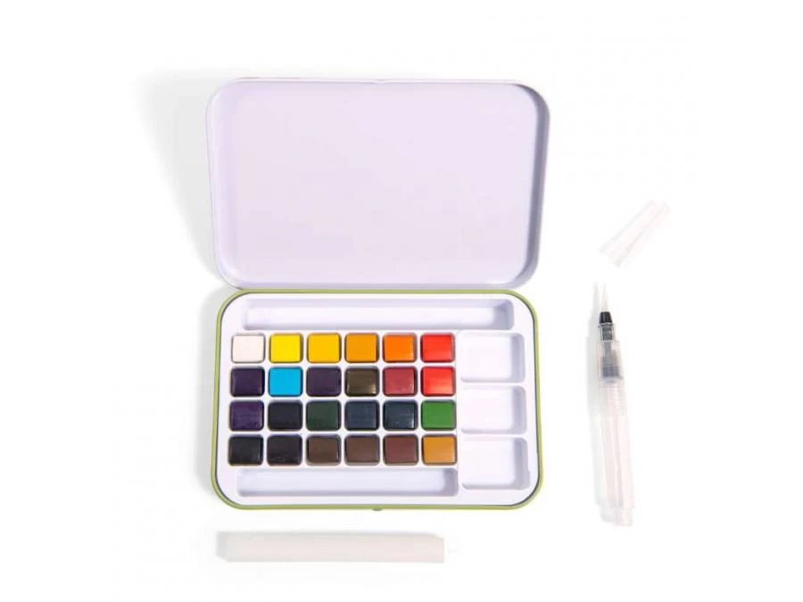 Boîte en métal avec 24 godets aquarelles aux couleurs intenses, un pinceau avec réservoir d’eau et une éponge. La boîte servira également de palette pour créer des mélanges de couleurs. Le kit idéal pour les artistes fans de nature !