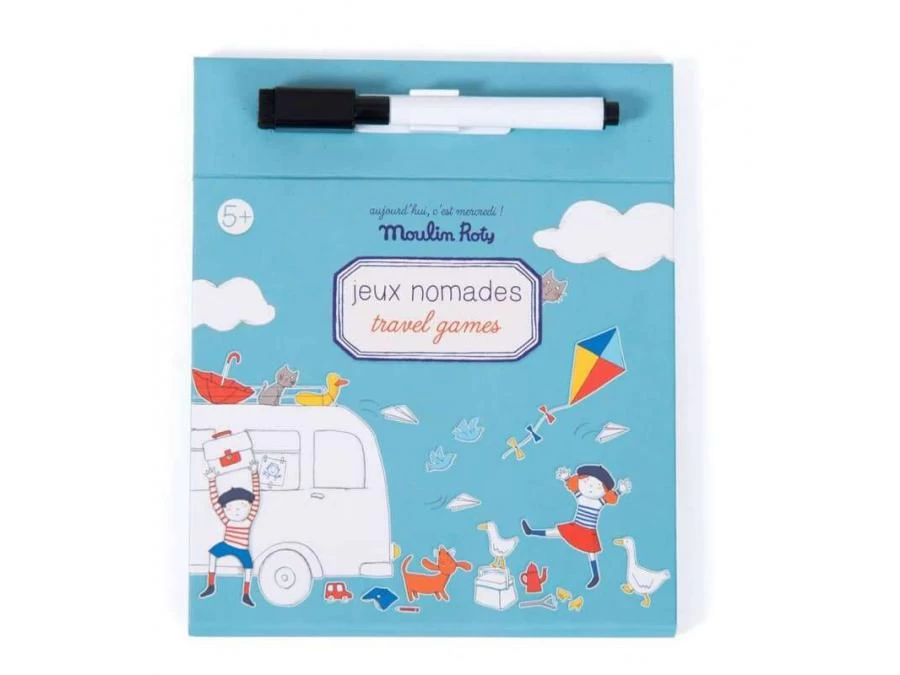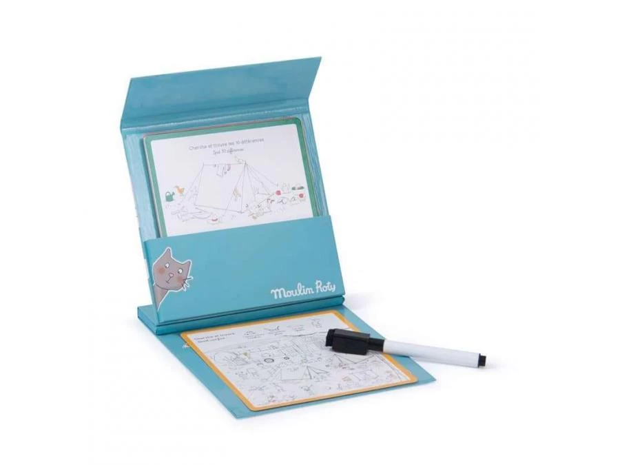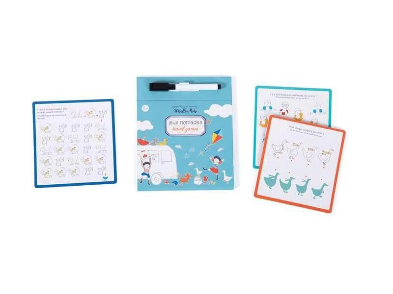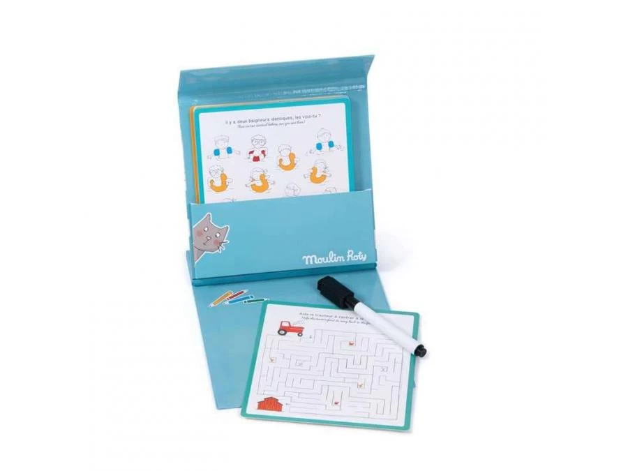 Jeux nomades à emporter partout avec soi ! La boîte comporte une planche de jeu, un crayon effaçable et 15 cartes de jeux d’observation et de logique, avec les solutions. Idéal pour occuper les enfants lors des longs trajets.