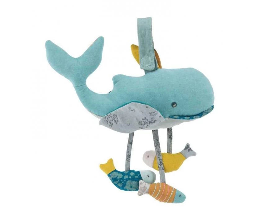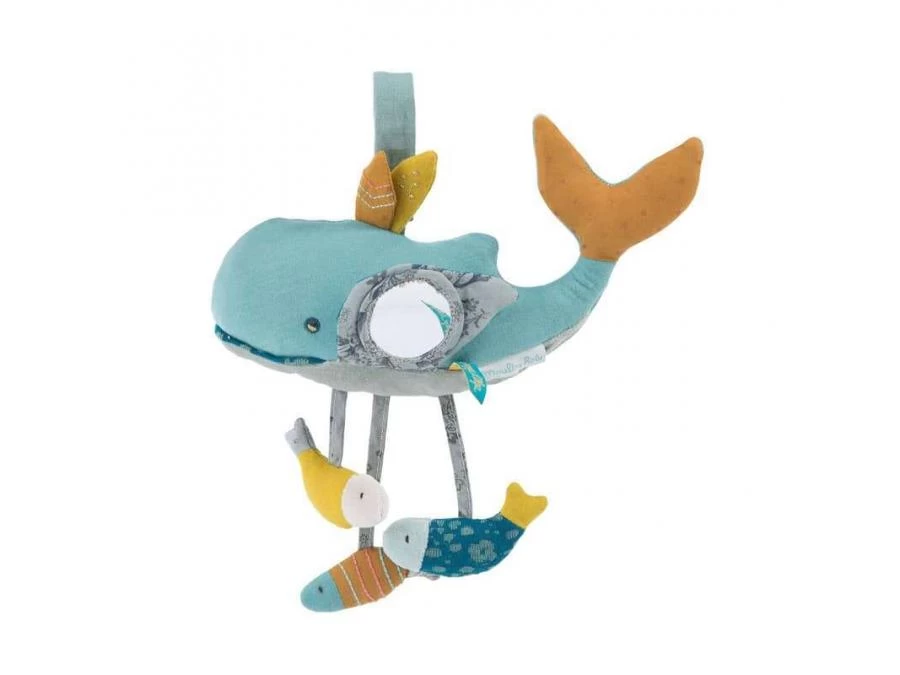 Baleine d’activités bleue en éponge velours accompagnée de ses petits poissons en lin et autres accessoires pour divertir bébé : pouet-pouet, miroir, hochet et plastique qui fait du bruit.