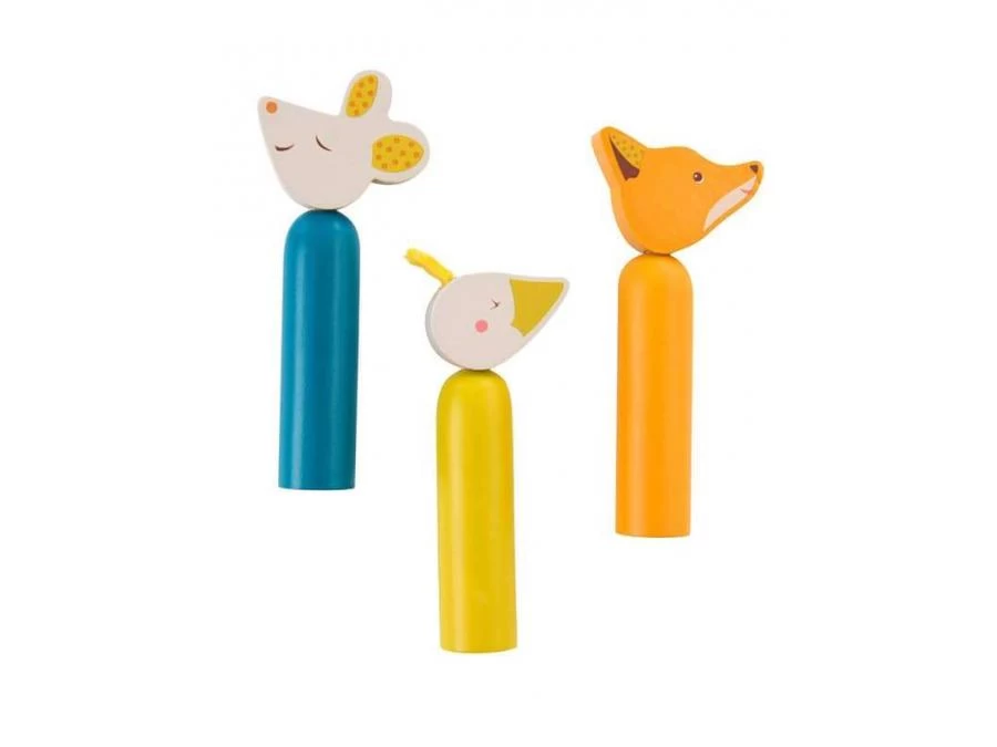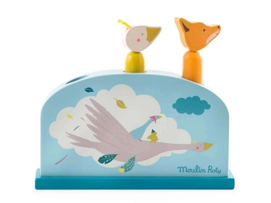Pop up en bois peint aux couleurs et illustrations de la gamme, avec trois personnages du voyage d’Olga : l’oie, la souris et le renard, prêts à sauter partout ! Jeu d’éveil qui consiste à appuyer sur la tête pour voir le personnage sauter.