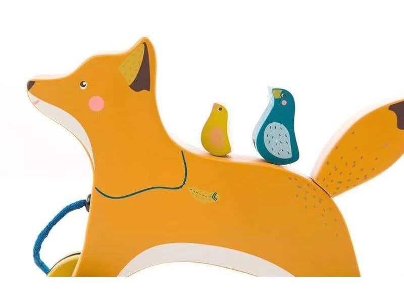 Renard en bois à tirer pour l’emmener partout avec soi, avec deux oiseaux compagnons posés sur son dos. Couleurs et illustrations rafinées à l’image de la gamme pour une touche de fantaisie.