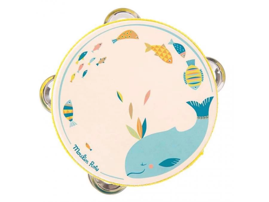 Tambourin 3 cymbales en bois crème avec ruban sur la tranche et illustrations folks et poétiques représentant la baleine de la gamme entourée, de ses petits poissons. Développe le rythme et l’éveil musical des tout-petits, facile à utiliser.
