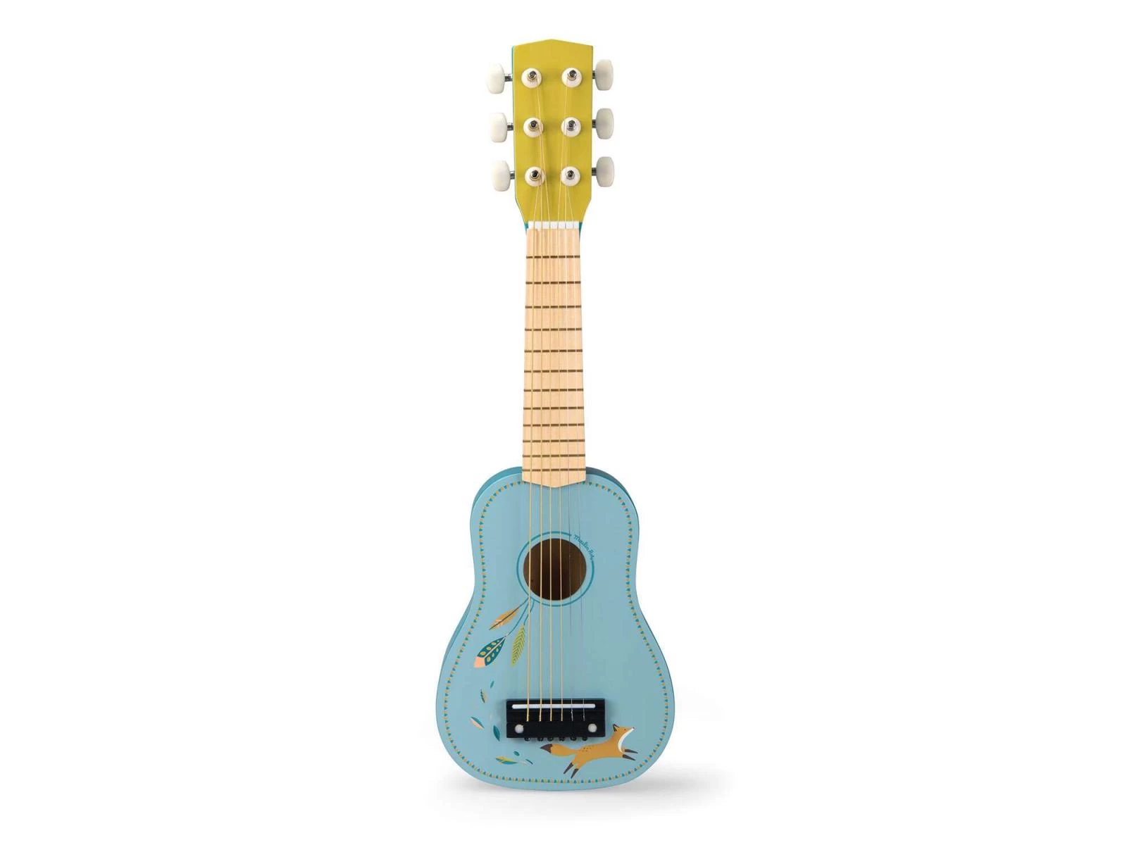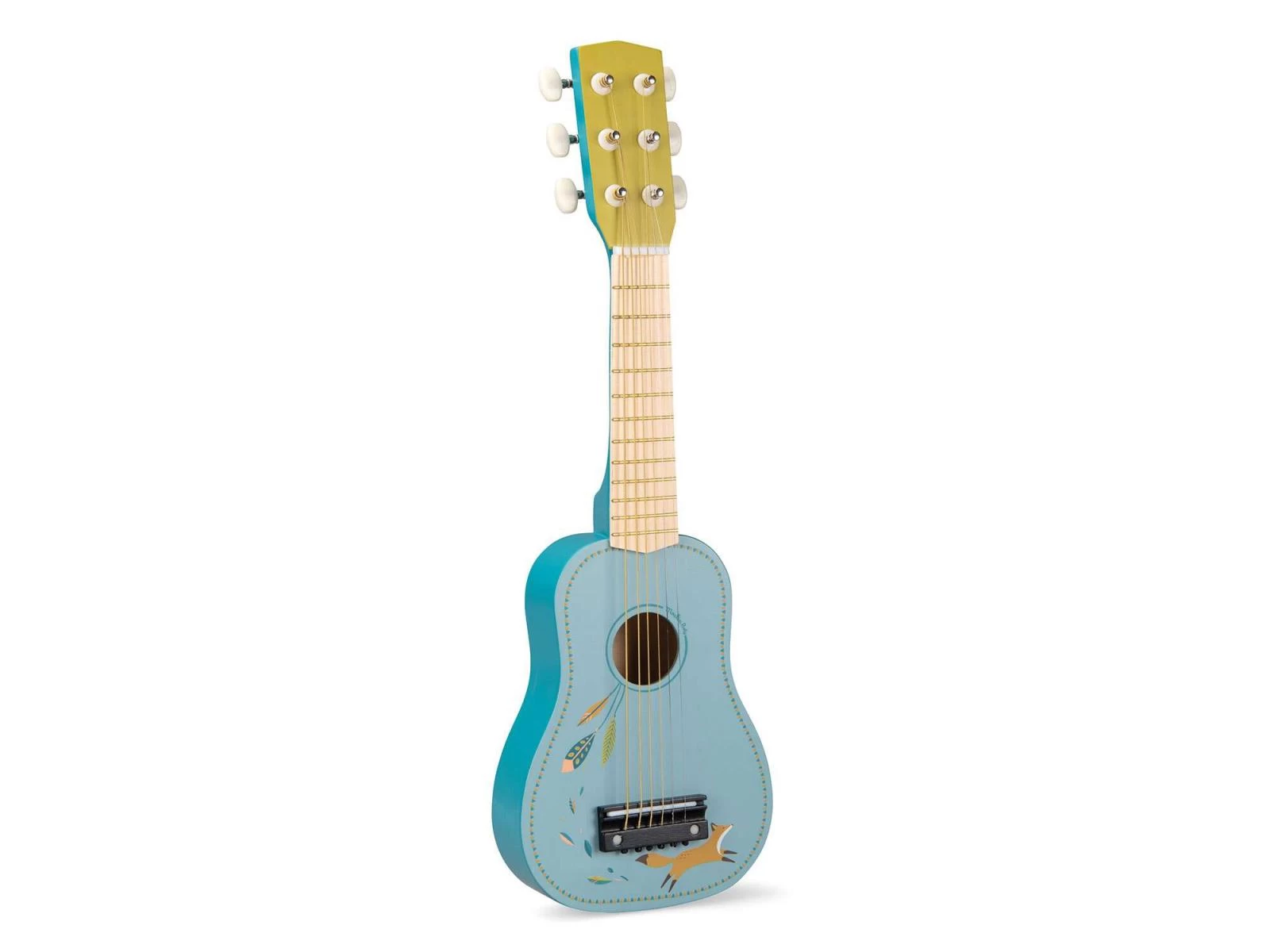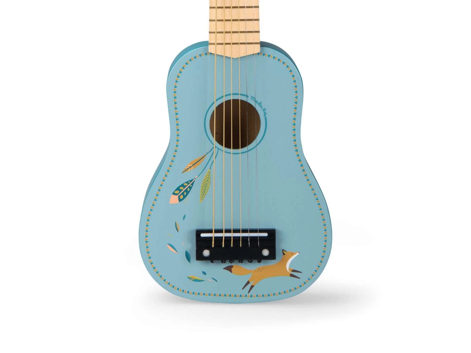 Pour petits musiciens, guitare à 6 cordes en bois coloré, aux illustrations folks et poétiques représentant le petit renard de la gamme entouré de plumes. Développe le rythme, la motricité et l’éveil musical des tout-petits.