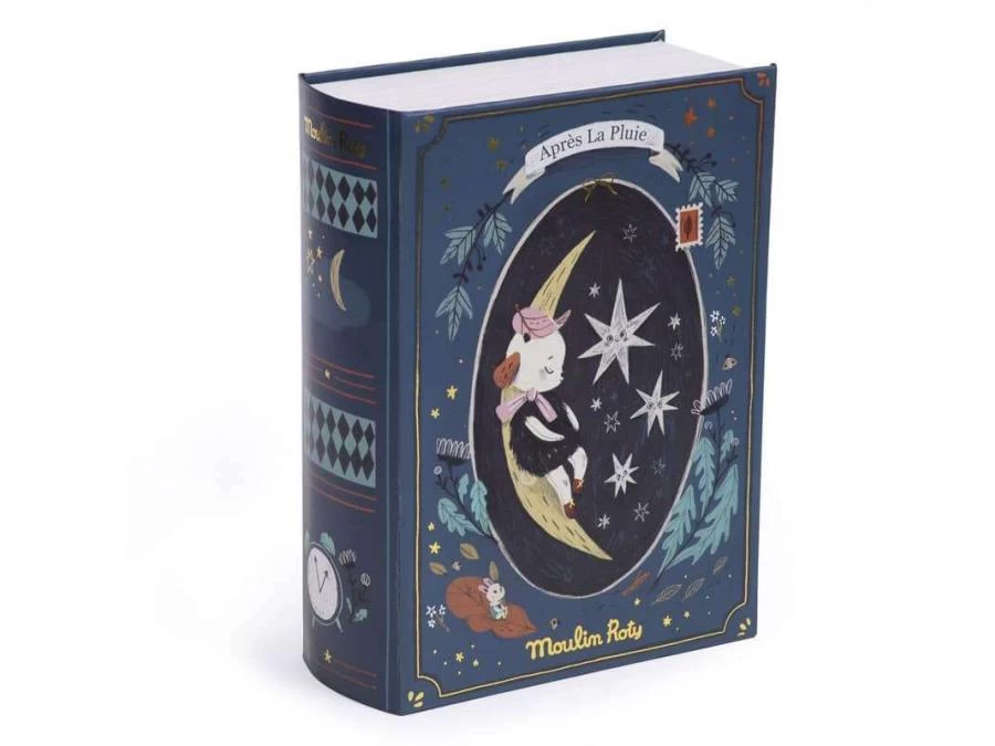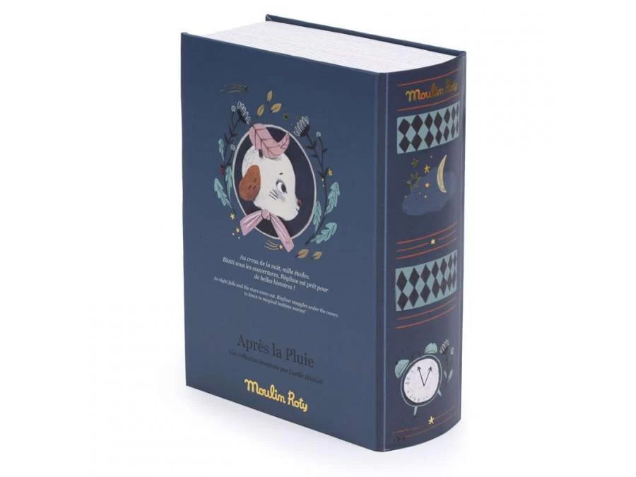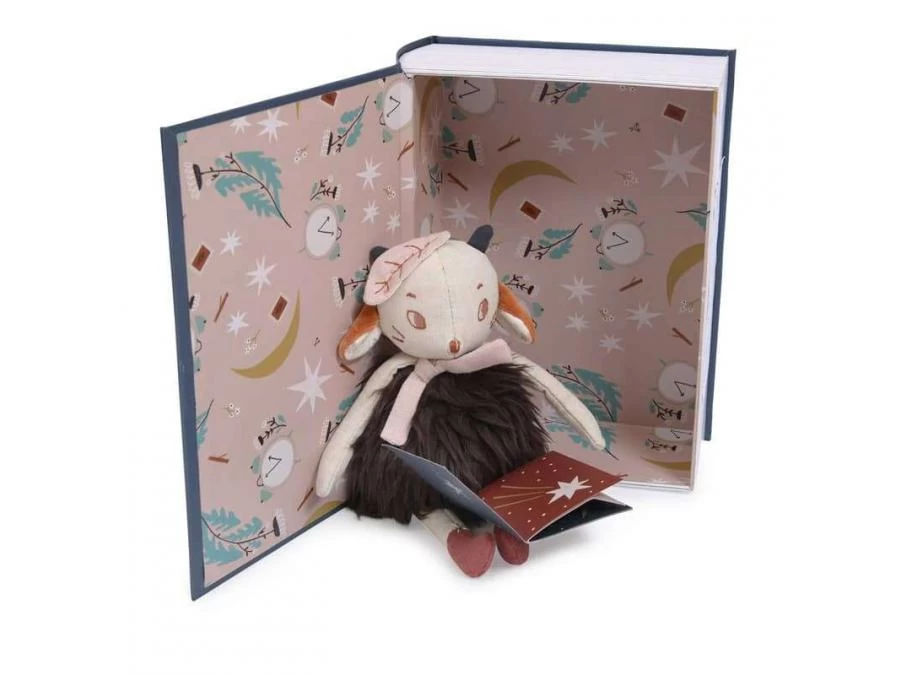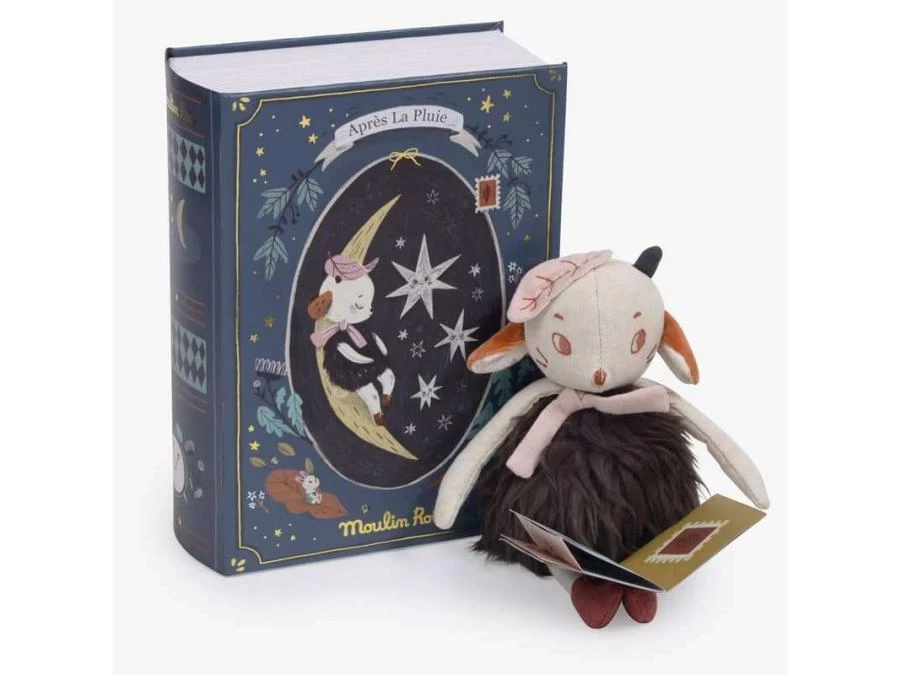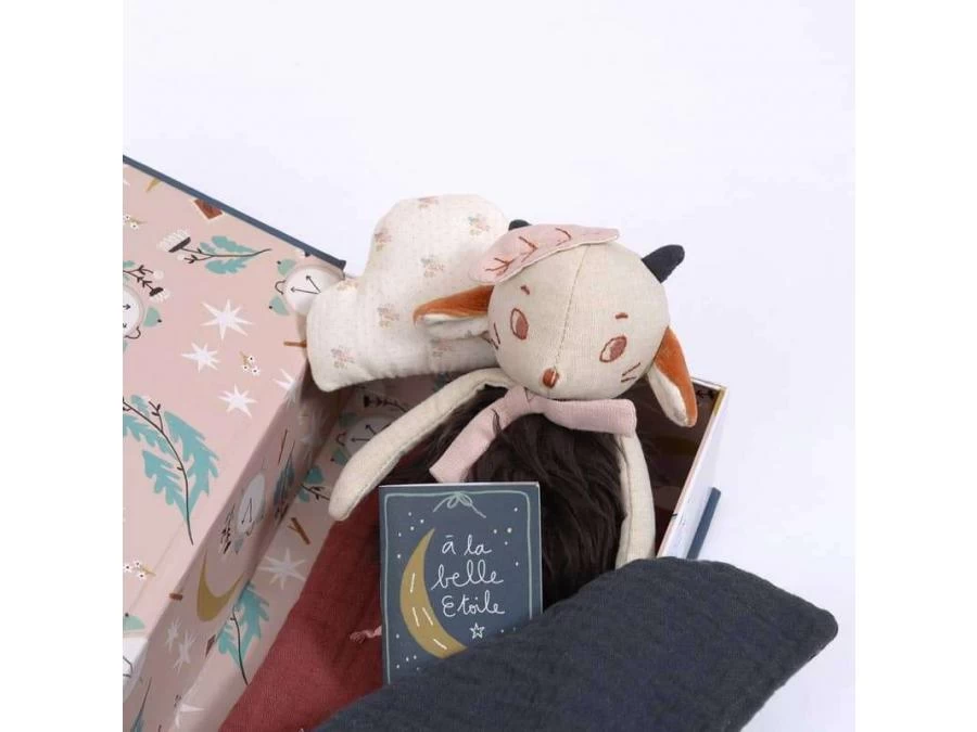 Dans sa boîte illustrée par Lucille Michieli, le mouton Réglisse en fourrure et tissu chambray est blotti sous sa couverture à pois, entre son matelas en lange et son coussin nuage. Il tient dans ses bras un mini-livre pour raconter de jolies histoires…