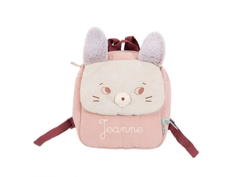 Sac en lange rose et chambray crème avec un adorable minois de souris brodé, et deux oreilles toutes douces en fourrure. Pratique et solide, il se ferme avec un zip et comprend une poche à l’avant. Il peut être brodé au prénom de l’enfant !