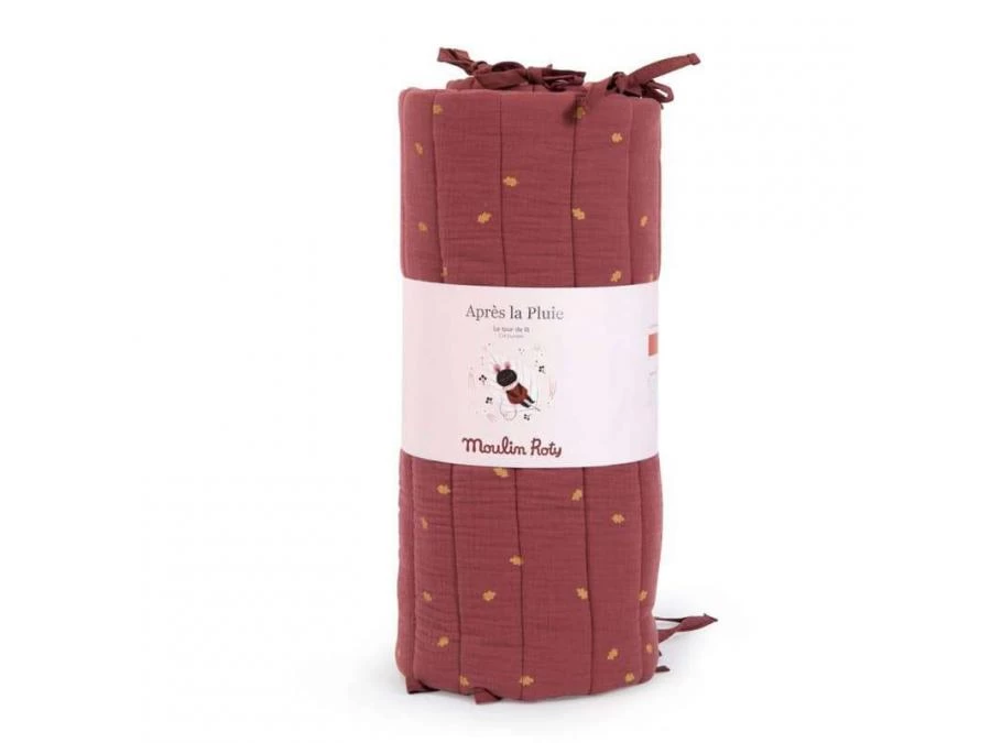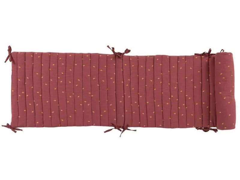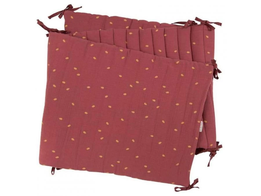 Tour de lit double épaisseur, en lange 100% coton pour une grande douceur. En plus de le protéger, il décore le lit de bébé de sa couleur terracotta, avec motif feuilles de chêne et un joli biais rose poudré.