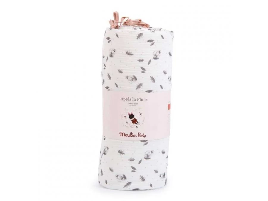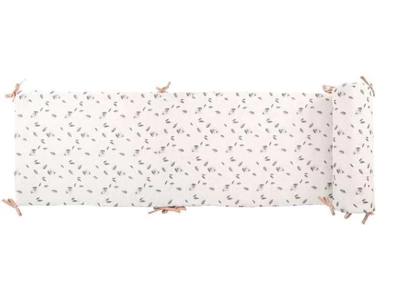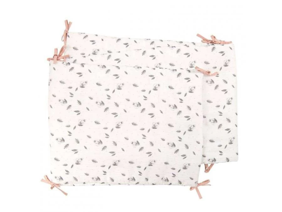 Tour de lit double épaisseur, en lange 100% coton pour une grande douceur. Il habille le lit de bébé avec son tendre motif de lapin endormi au milieu des feuilles d’automne, imprimé sur un tissu crème, et souligné par un biais et des lanières roses.
