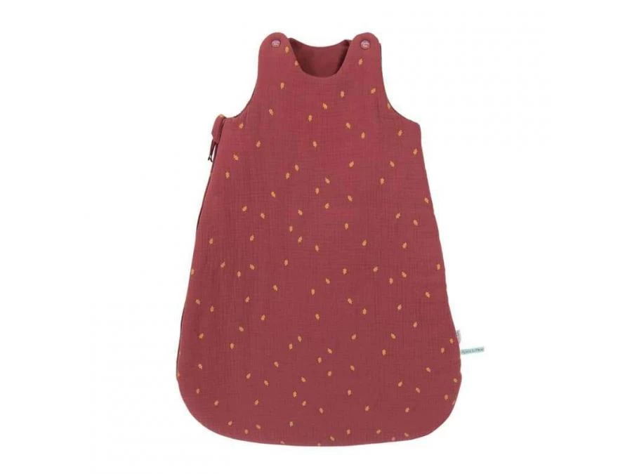 Gigoteuse 0-6 mois (TOG 3) en matières naturelles : lange terracotta avec motif feuilles de chêne sur l’extérieur, et doublure en toile 100% coton pour laisser respirer la peau de bébé. Fermeture à glissière et boutons-pression pour un habillage facile.