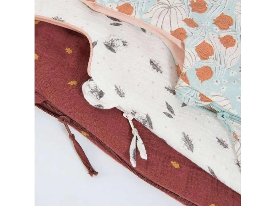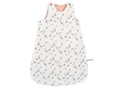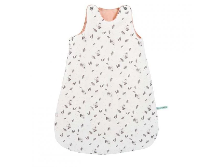 Gigoteuse 0-6 mois (TOG 3) en matières naturelles : lange crème avec motif lapin endormi et feuilles volantes, et doublure en toile 100% coton pour laisser respirer la peau de bébé. Fermeture à glissière et boutons-pression pour un habillage facile.