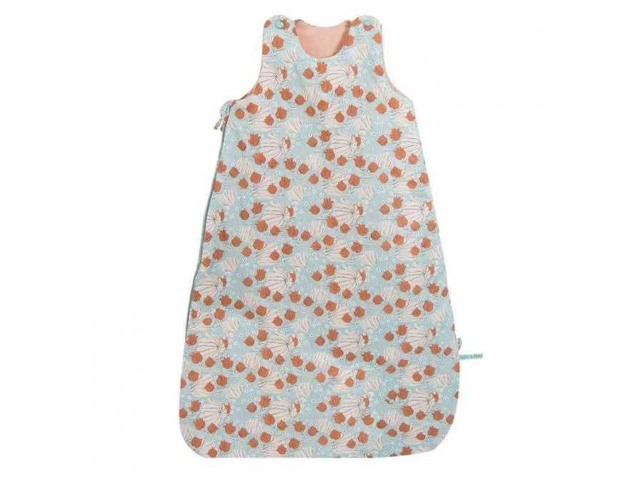 Gigoteuse 6-24 mois (TOG 3) en matières naturelles : tissu 100% coton pour laisser respirer la peau de bébé, avec imprimé de fleurs à l’extérieur et doublure en toile rose. Fermeture à glissière et boutons-pression pour un habillage facile.