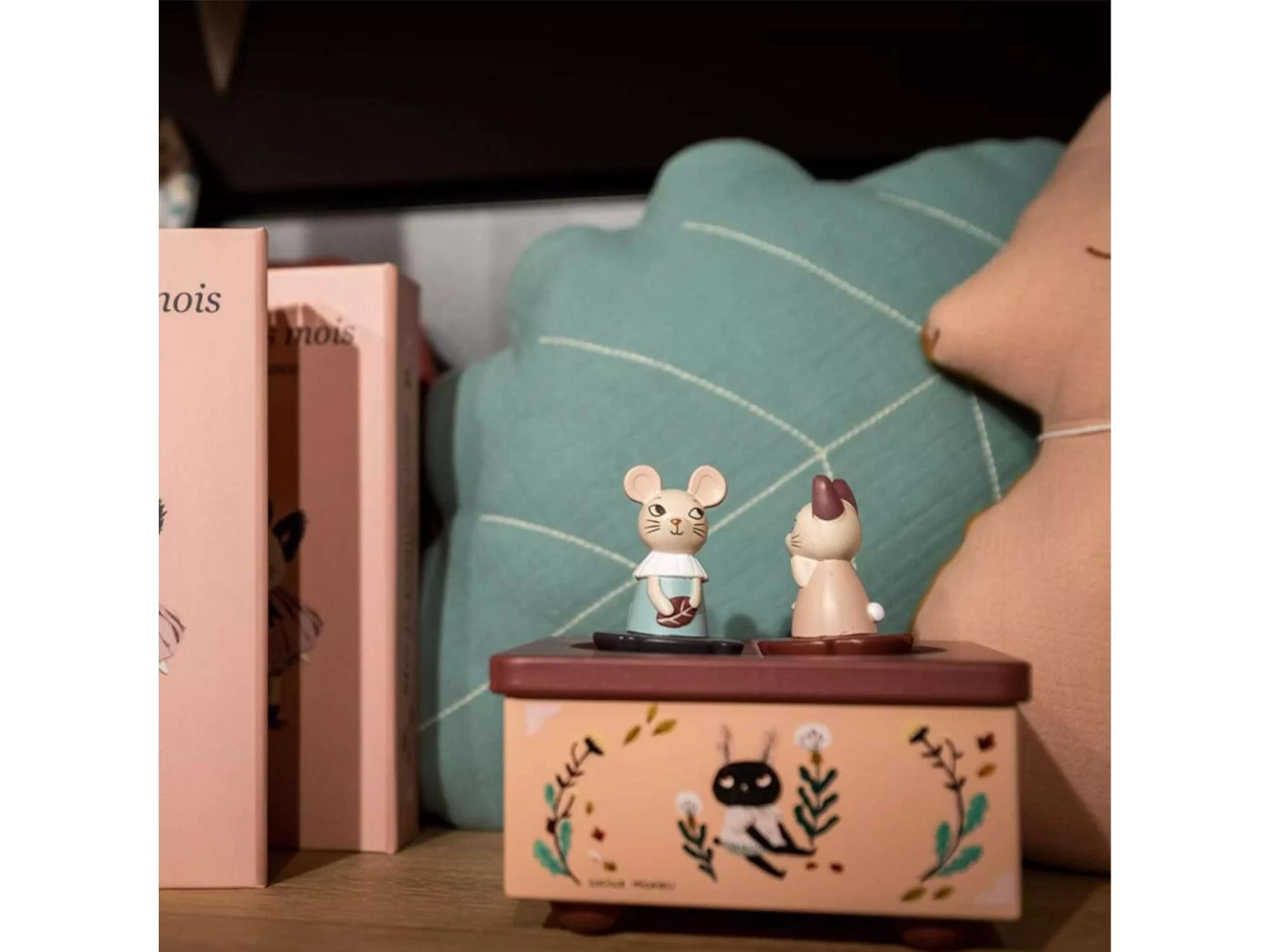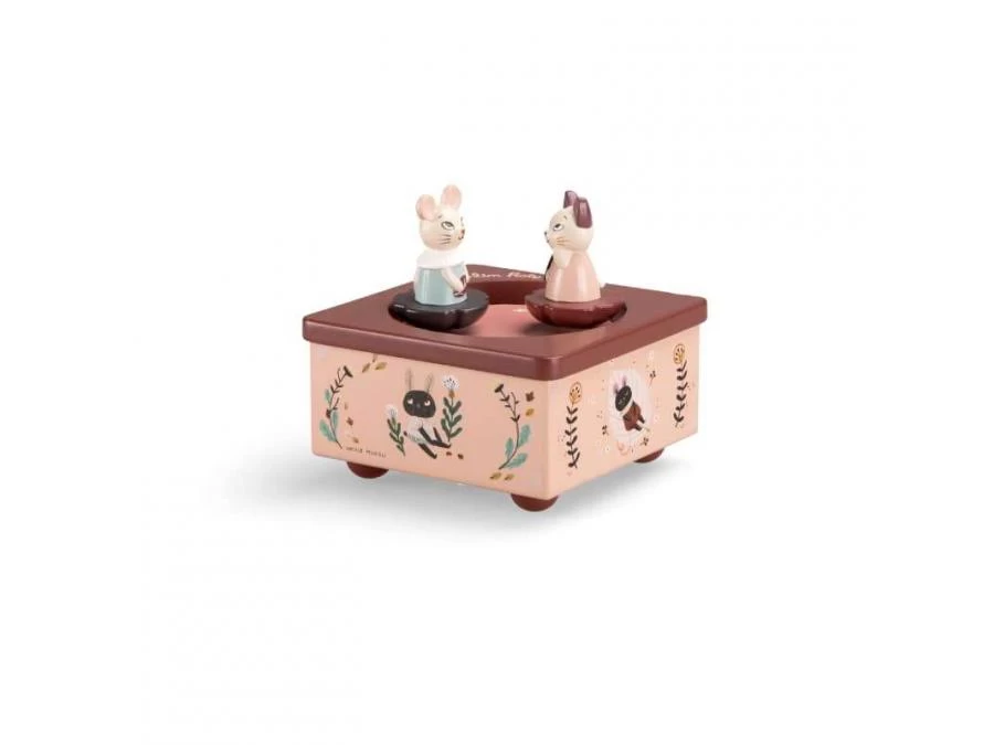Boîte à musique aux couleurs de la gamme, reprenant les illustrations et personnages de la collection. Giboulée le Chat et Brume la souris tournent et dansent sur une jolie musique pour bercer et endormir bébé.