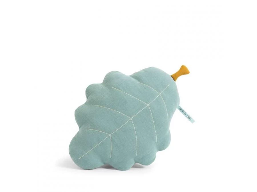 Coussin déco ou dodo en lange de coton biologique, en forme de feuille de chêne. Turquoise et ocre, il décorera la chambre de bébé de ses jolies couleurs !