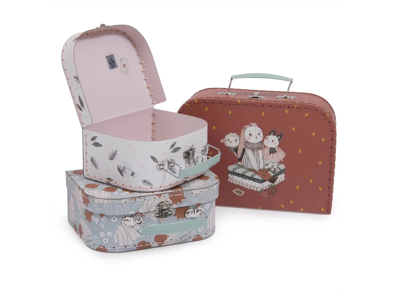 Set de 3 valises déco de formats différents, en carton avec finition cousue, poignée et ouverture métal. Illustrées de l’univers délicat d’Après la pluie, elles permettront de ranger et transporter tous les personnages et trésors de la collection !