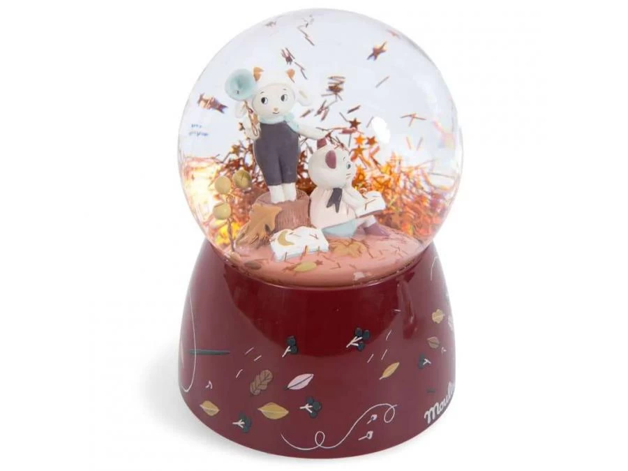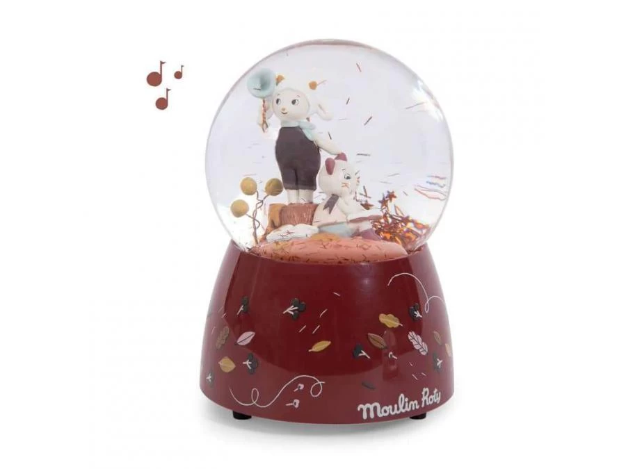 Boule à neige musicale avec Brume en pleine lecture, et Nuage debout pour attraper les paillettes brillantes ! En plus de décorer sa chambre, une jolie mélodie viendra bercer bébé au moment du coucher…