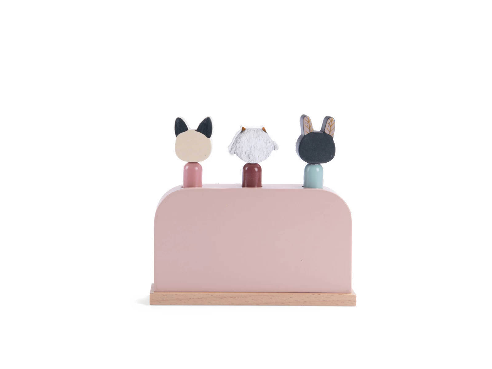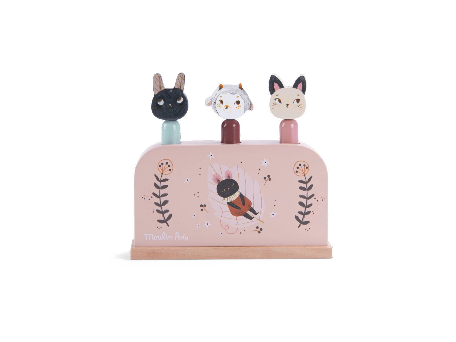 Pop up en bois composé d’un socle et de 3 personnages de la collection Après la Pluie, prêts à sauter partout ! Jeu d’éveil qui consiste à appuyer sur la tête pour voir le personnage bondir et le faire sortir de sa cachette.