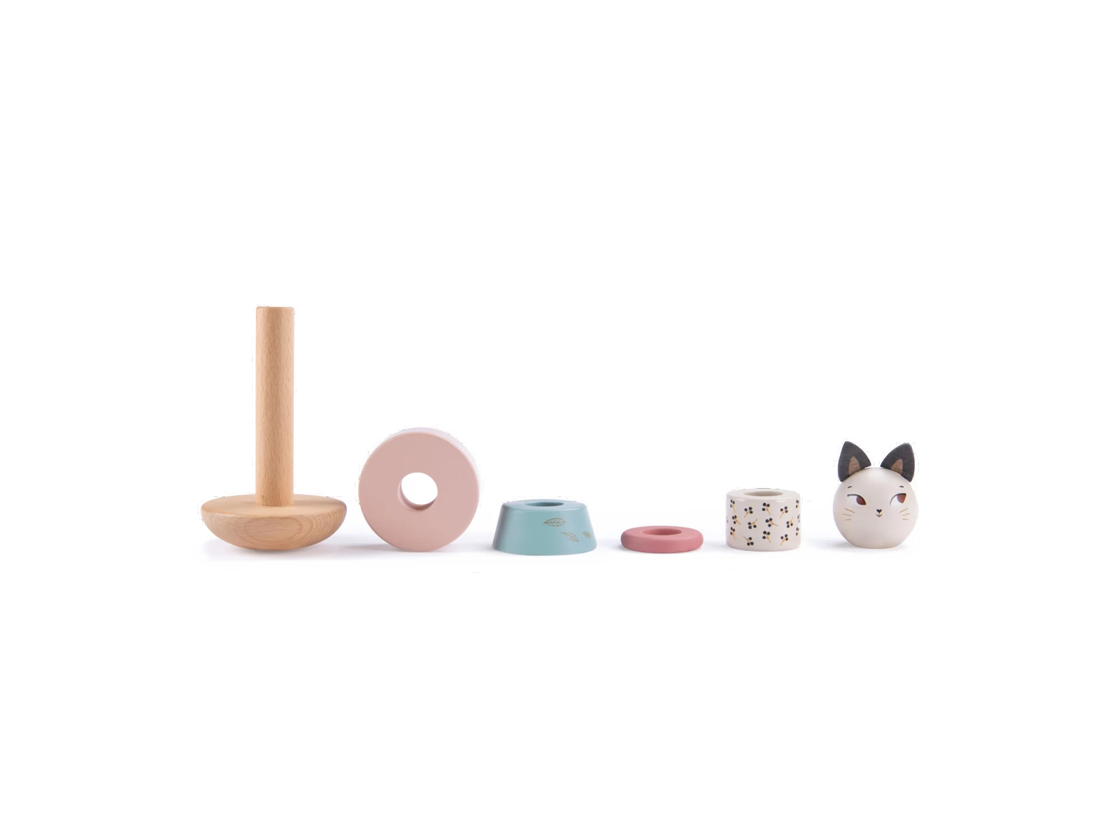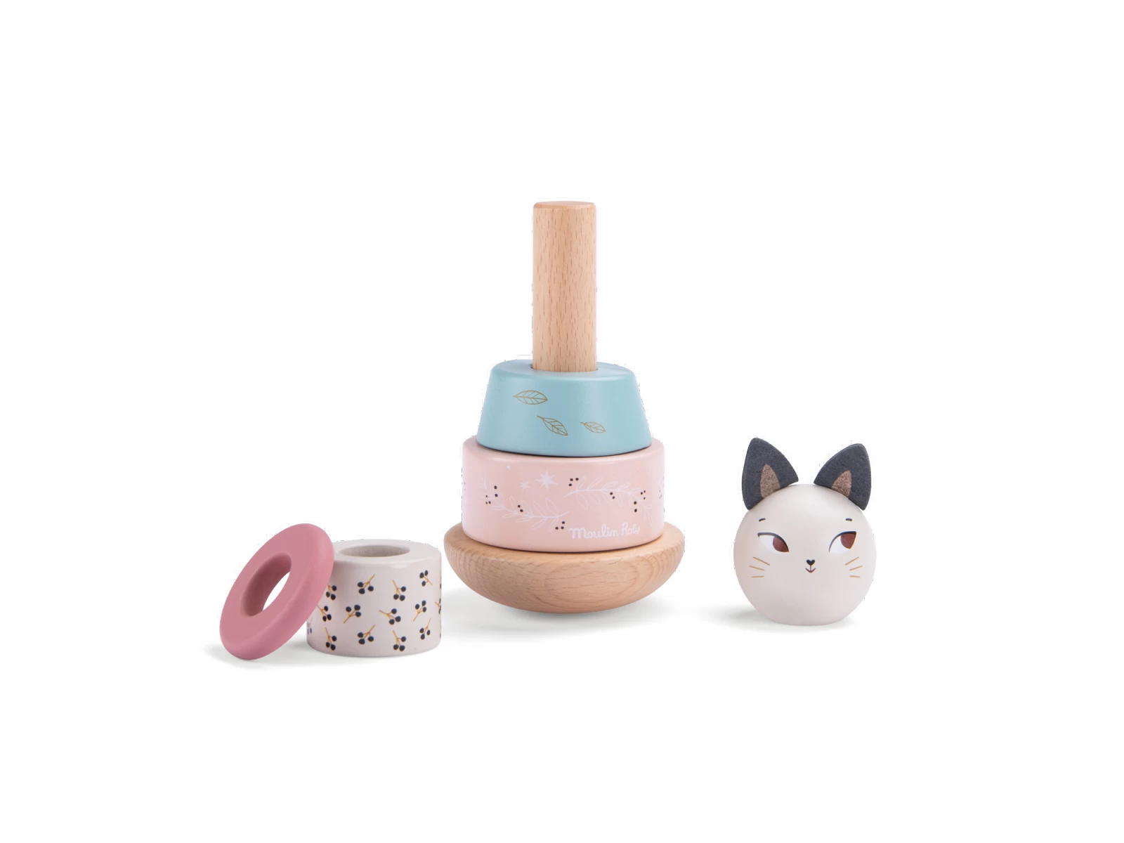 Un classique parmi les jeux en bois. Bébé devra empiler sur le culbuto, un à un les 4 anneaux aux formes et couleurs variées ainsi que la tête pour former le chat Giboulée. A monter et démonter à l’infini…