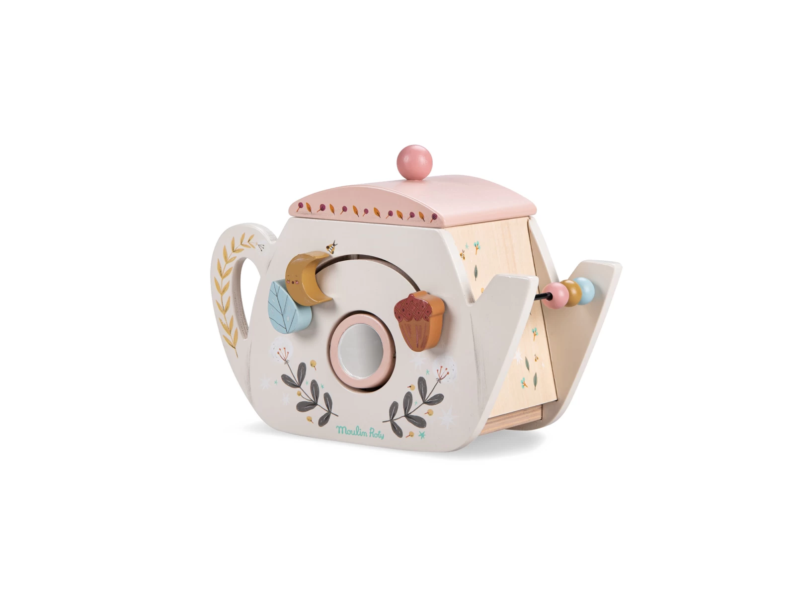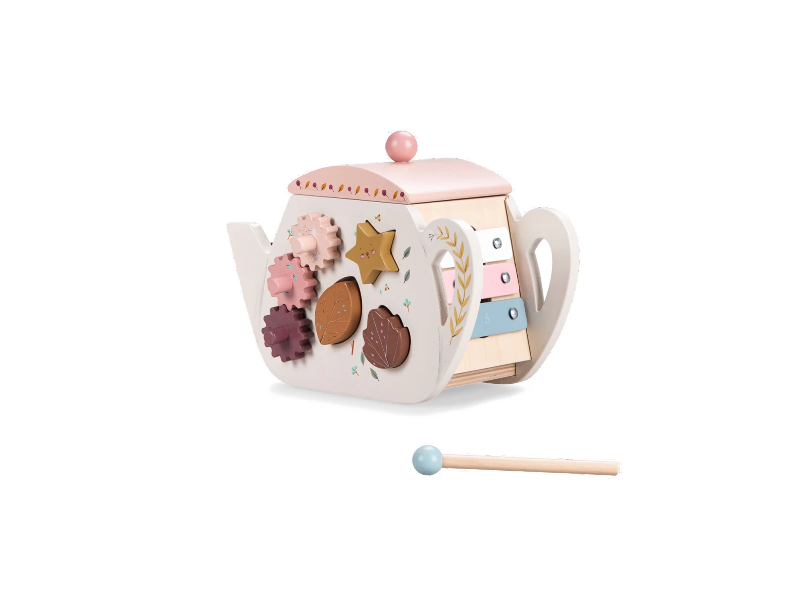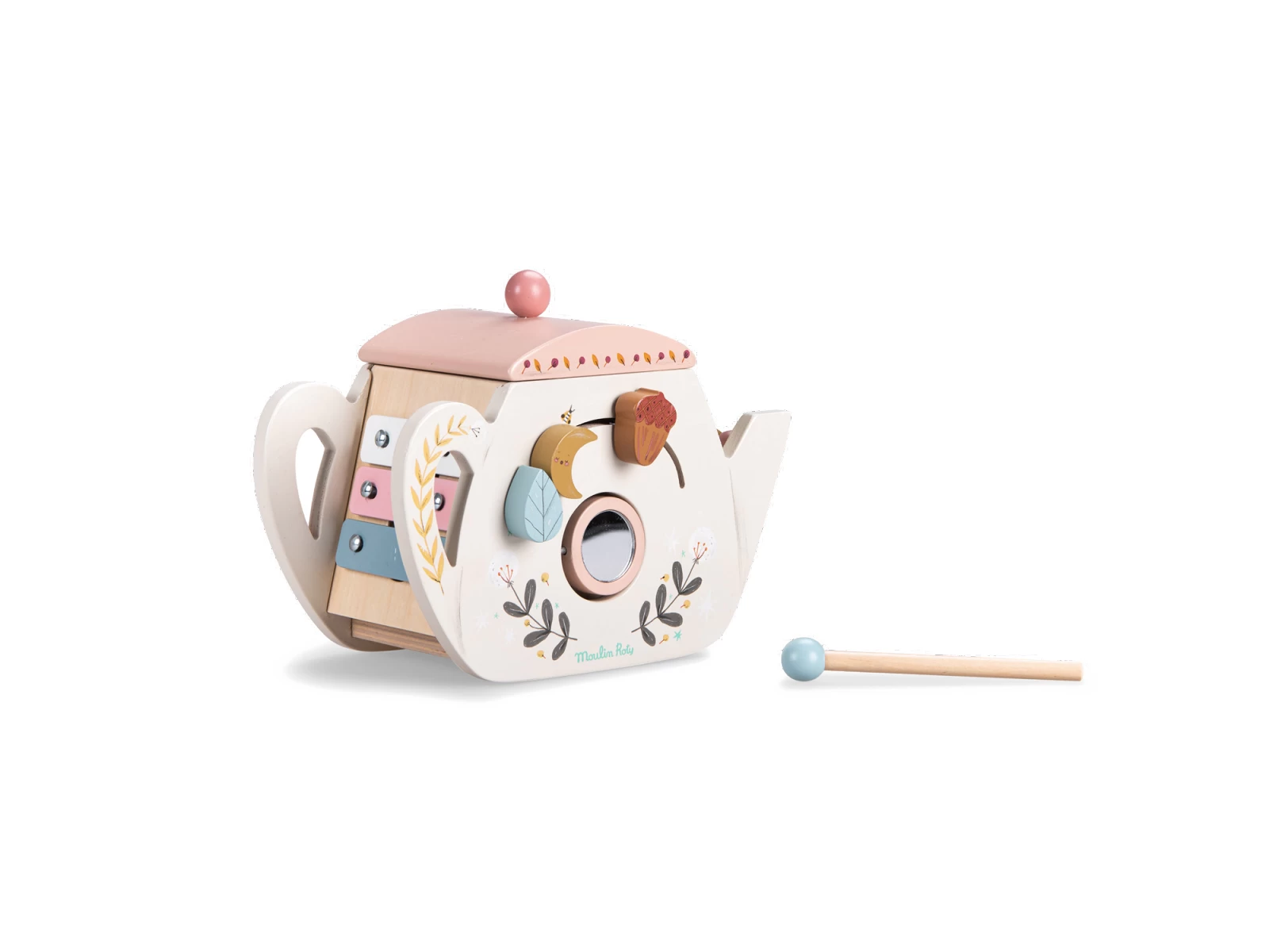 En voilà une jolie théière d’activités en bois pour bébé ! Chacune des 4 faces lui promet de jolies découvertes de jeux et d’apprentissages : boulier, formes à encaster, roues dentées à faire tourner, xylophone… Il y a même un petit miroir dissimulé!