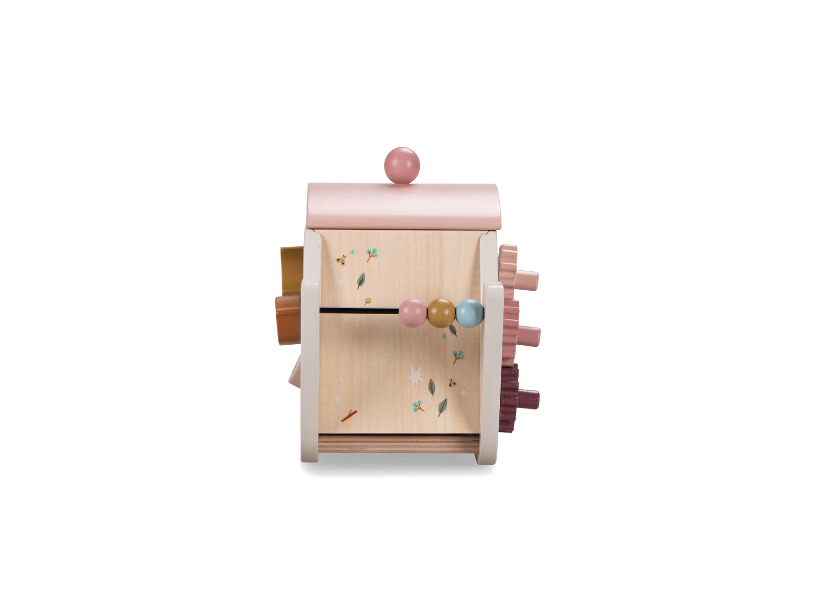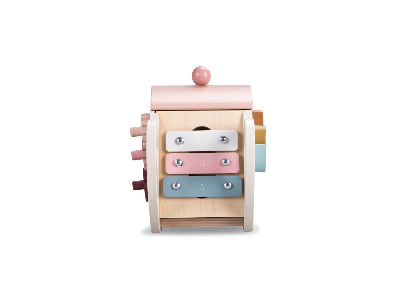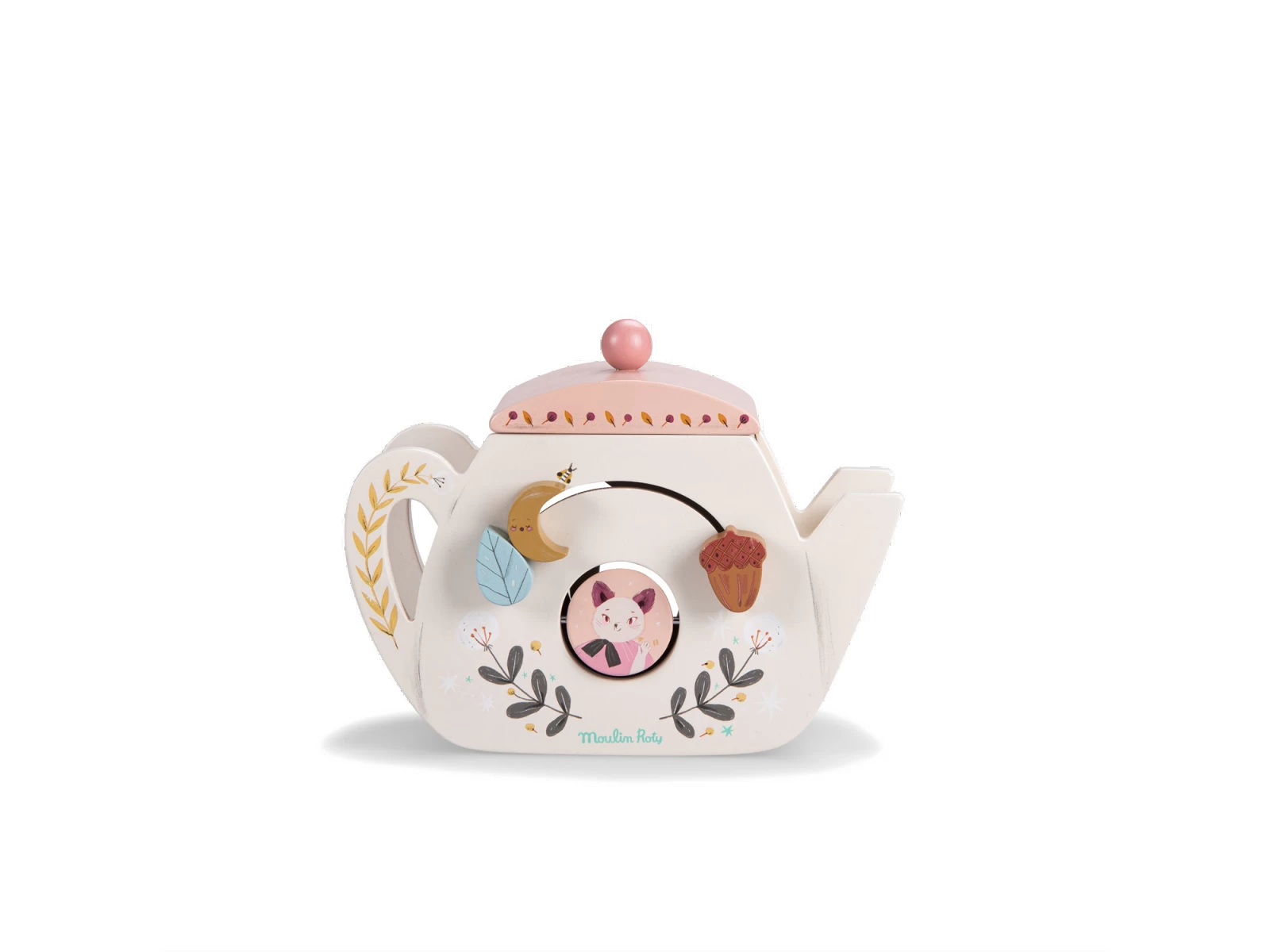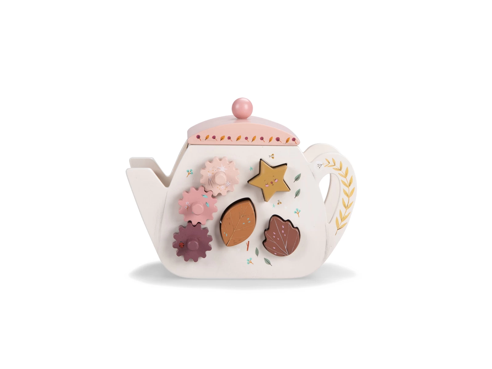En voilà une jolie théière d’activités en bois pour bébé ! Chacune des 4 faces lui promet de jolies découvertes de jeux et d’apprentissages : boulier, formes à encaster, roues dentées à faire tourner, xylophone… Il y a même un petit miroir dissimulé!