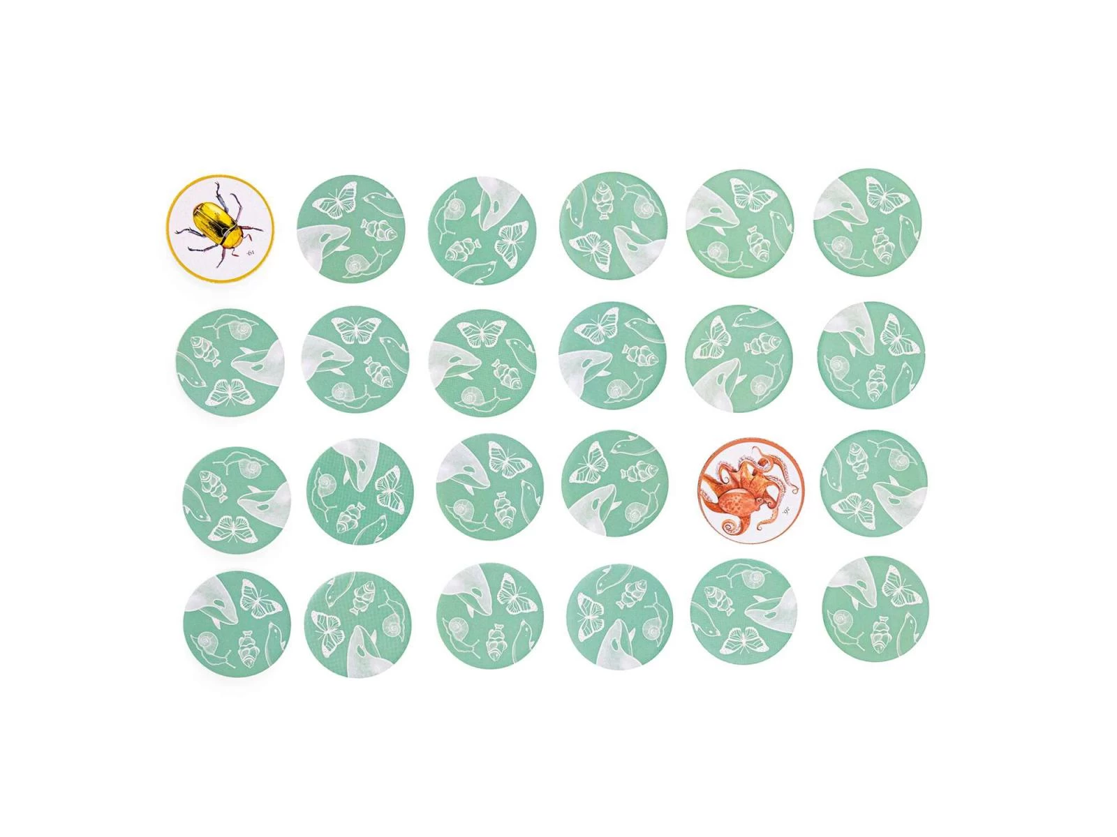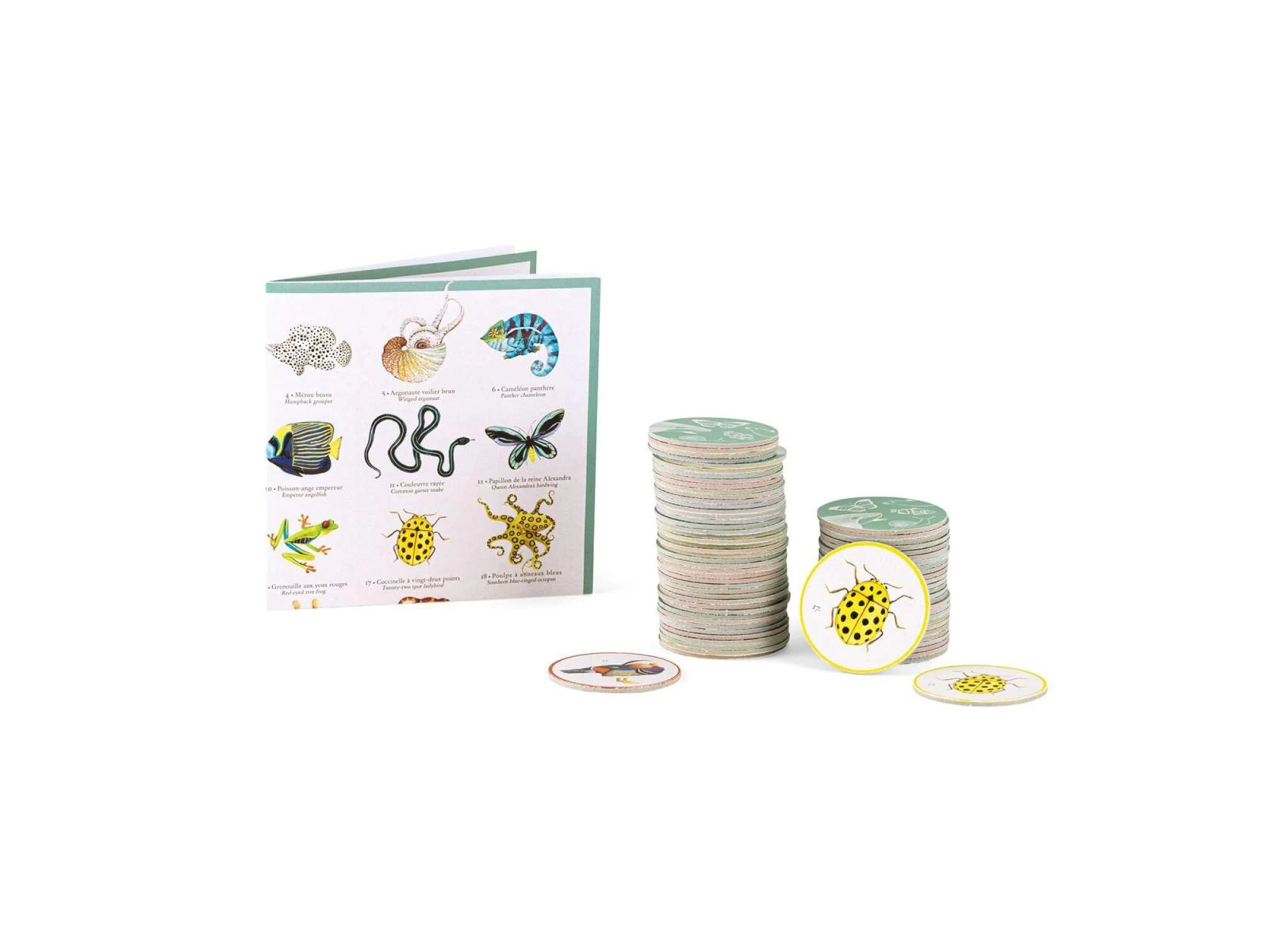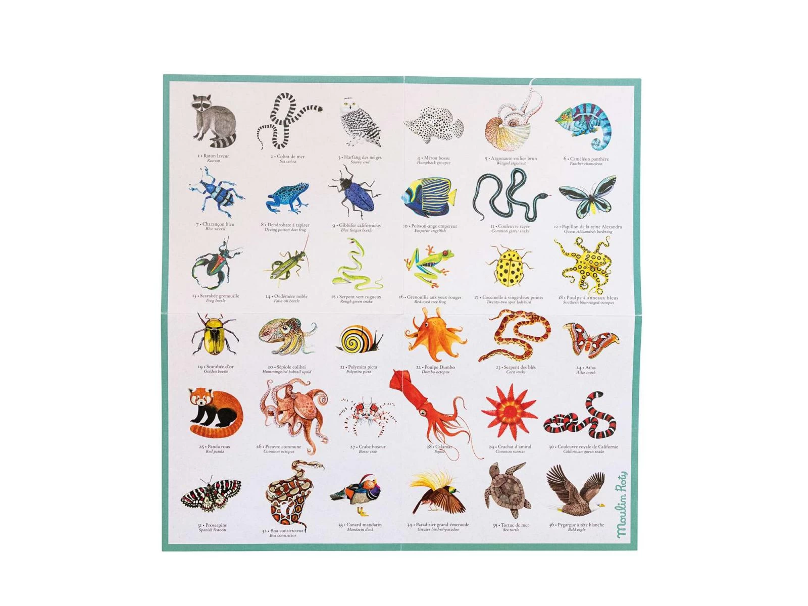 Jeu d’observation et de mémoire qui aborde le thème des animaux ! Toutes les cartes sont faces cachées sur la table, celui qui collecte le plus de paires d’animaux est le gagnant. Contient 36 cartes animaux x 2 et 1 poster.