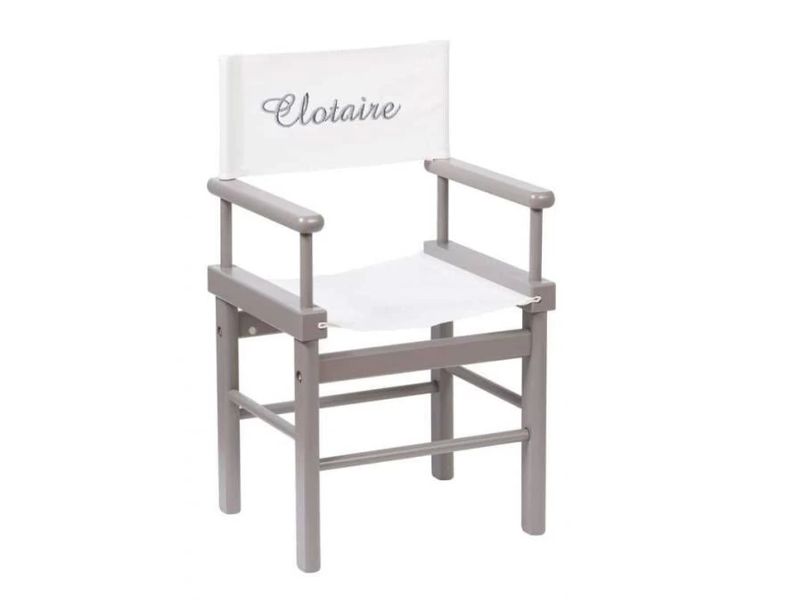 Fauteuil de metteur en scène en bois massif peint en gris foncé, avec dossier en tissu coton à broder au prénom de l’enfant.