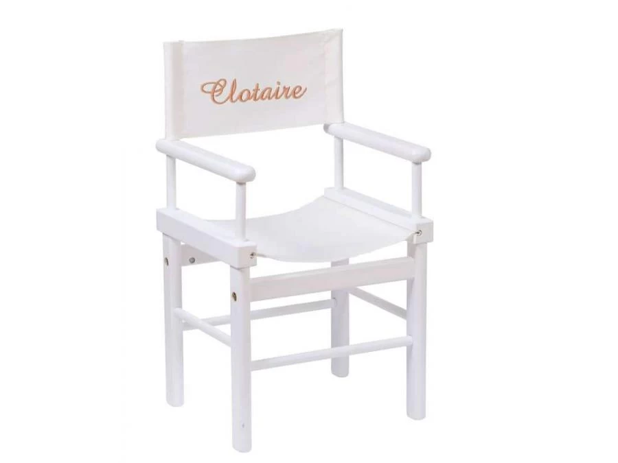 Fauteuil de metteur en scène en bois massif peint en blanc, avec dossier en tissu coton à broder au prénom de l’enfant.