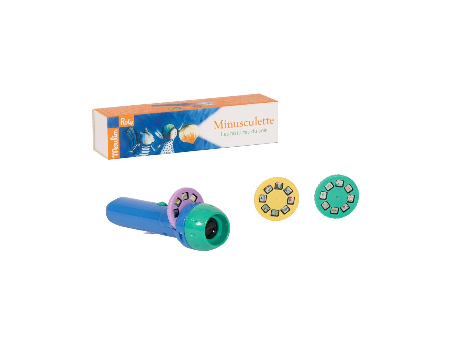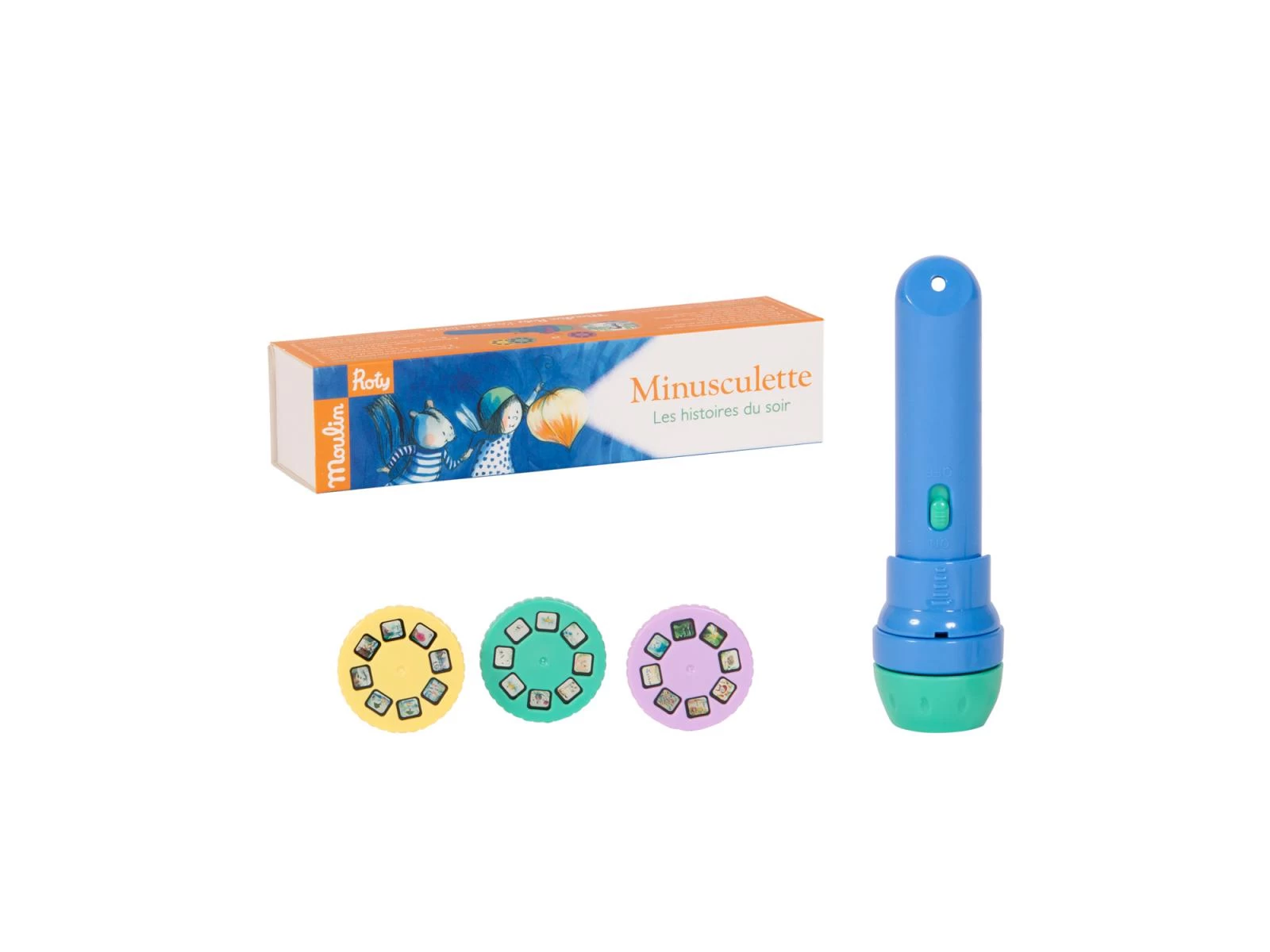 Lampe torche de poche où chacun des 3 disques projetés sur le mur raconte les aventures de Minusculette, une petite héroïne féérique de l’école des loisirs. Pour endormir les tout-petits et développer leur imagination !