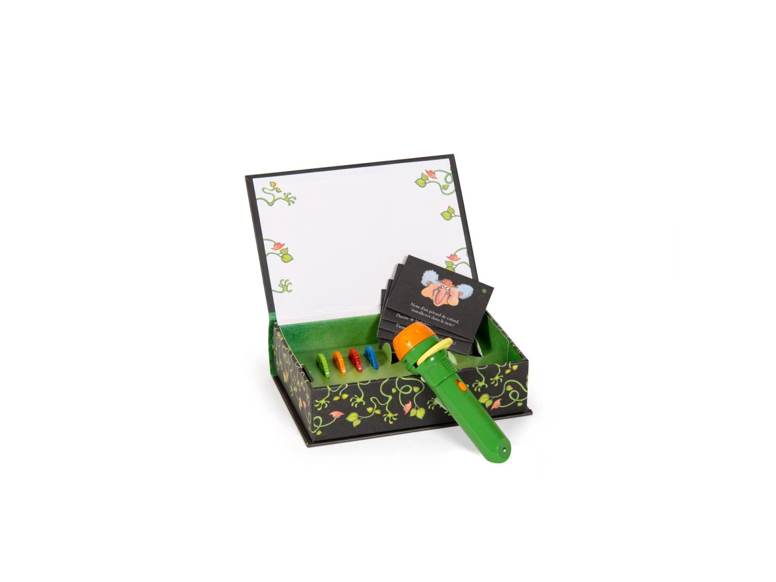Ravissant coffret aimanté, joliment illustré, conçu comme un livre comprenant : une lampe à projeter, 5 disques et 5 invitations. Chaque disque, projeté sur le mur, raconte une histoire de Cornebidouille la sorcière de l’école des loisirs.