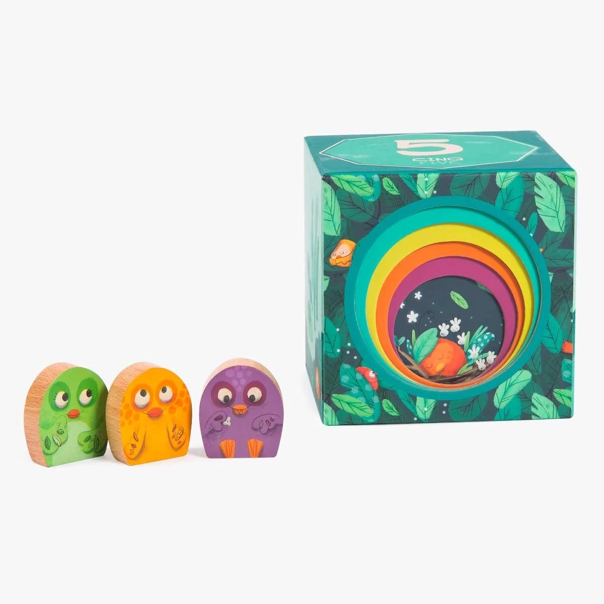 Les 6 cubes s’empilent pour former de jolies histoires illustrées, ou apprendre à compter… Et surprise ! Au cœur des marécages et sous d’immenses feuillages, 3 poussins en bois jouent à cache-cache dans ce drôle d’habitat.